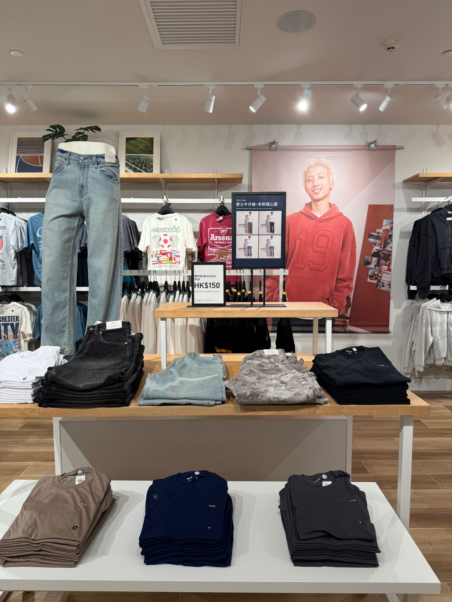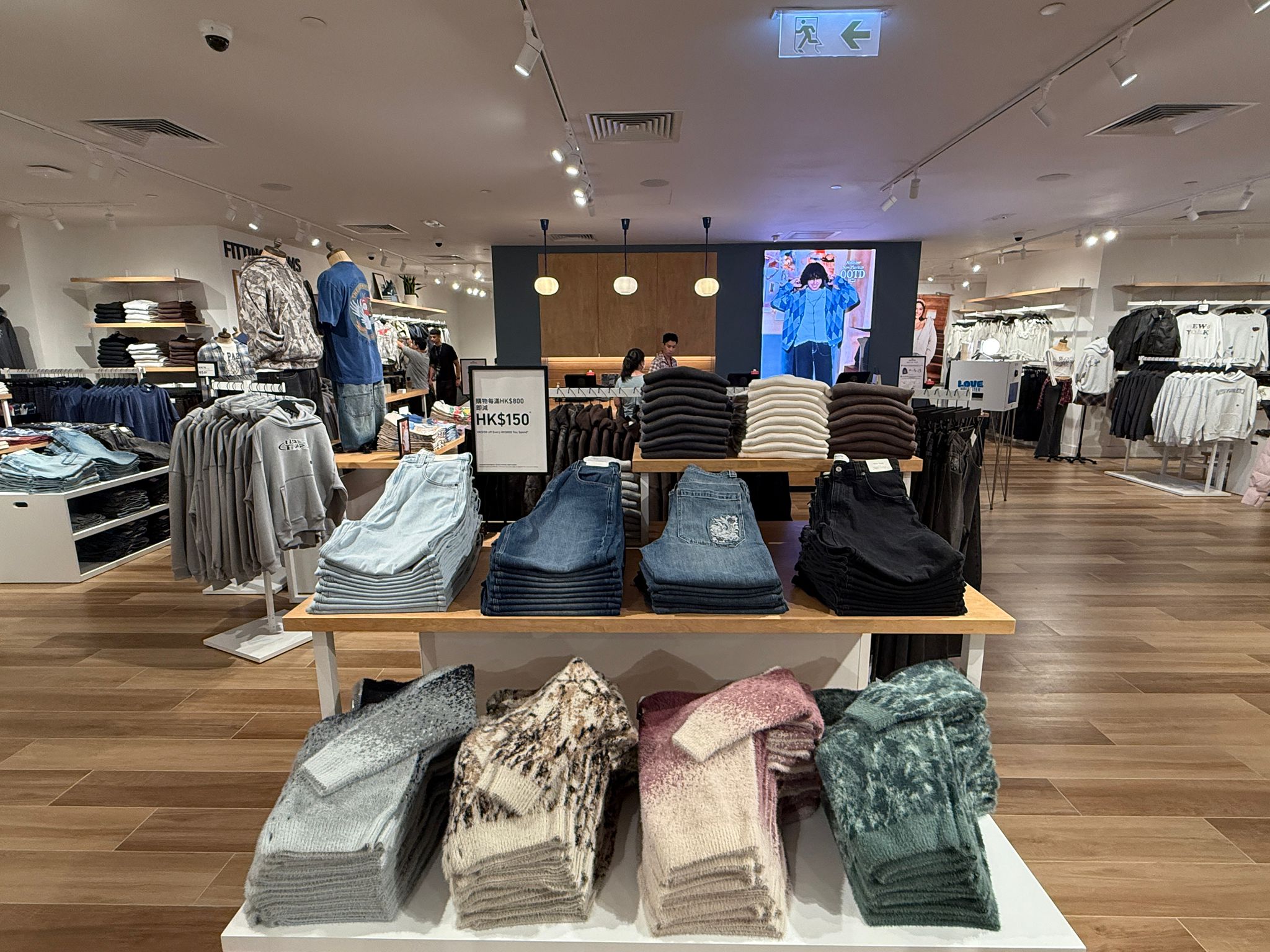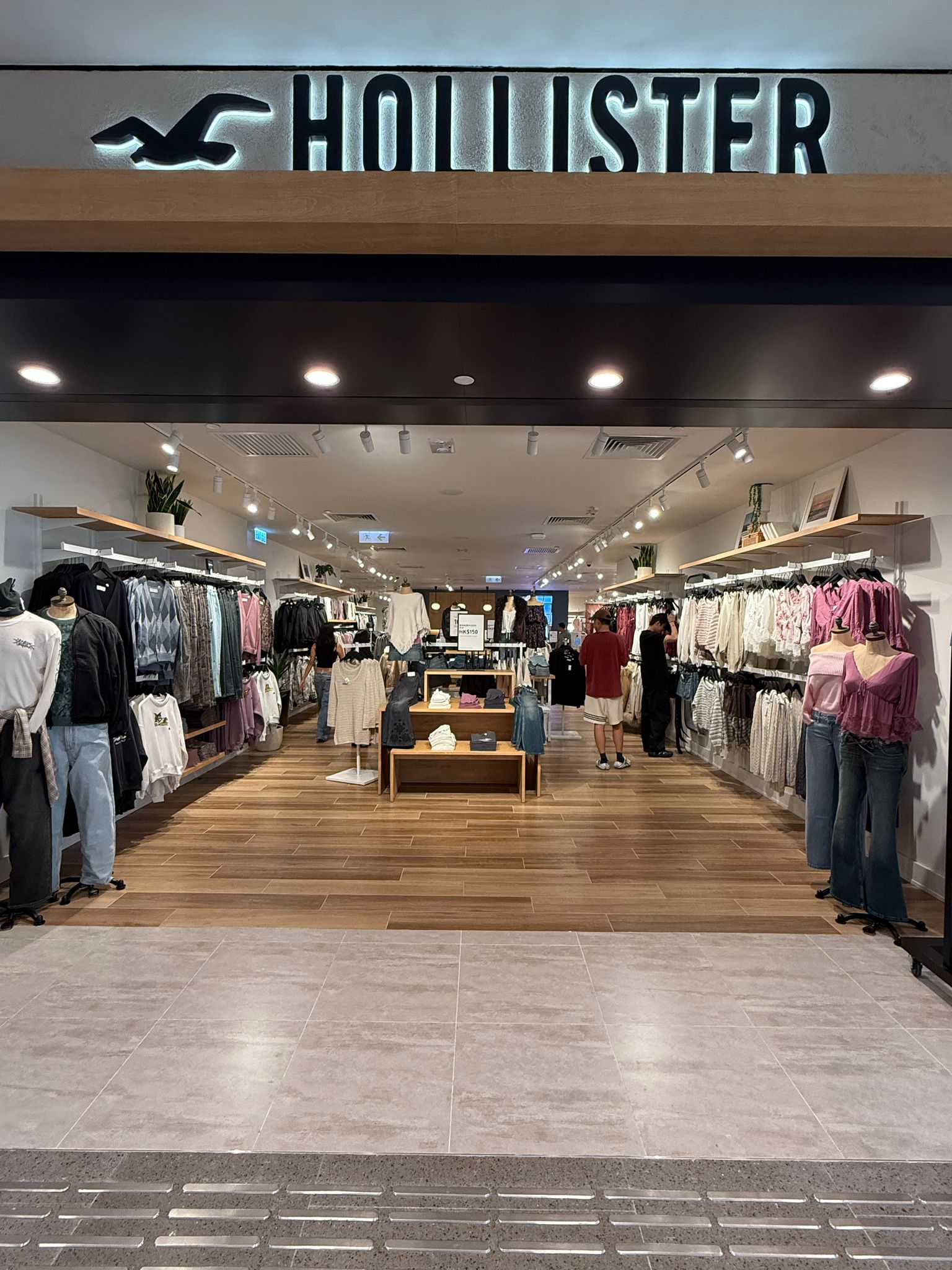 全新Hysan Place 升級概念店以 Hollister House 設計呈現,一改以往暗色系風格,融合自然簡約與美式復古元素,明亮開放式空間,原木地板配白色牆身,搭配綠植點綴,營造南加州般的自在氛圍。獨特門面設計,純色背景搭配搶眼 Logo,櫥窗展示當季新品,營造高辨識度品牌形象。