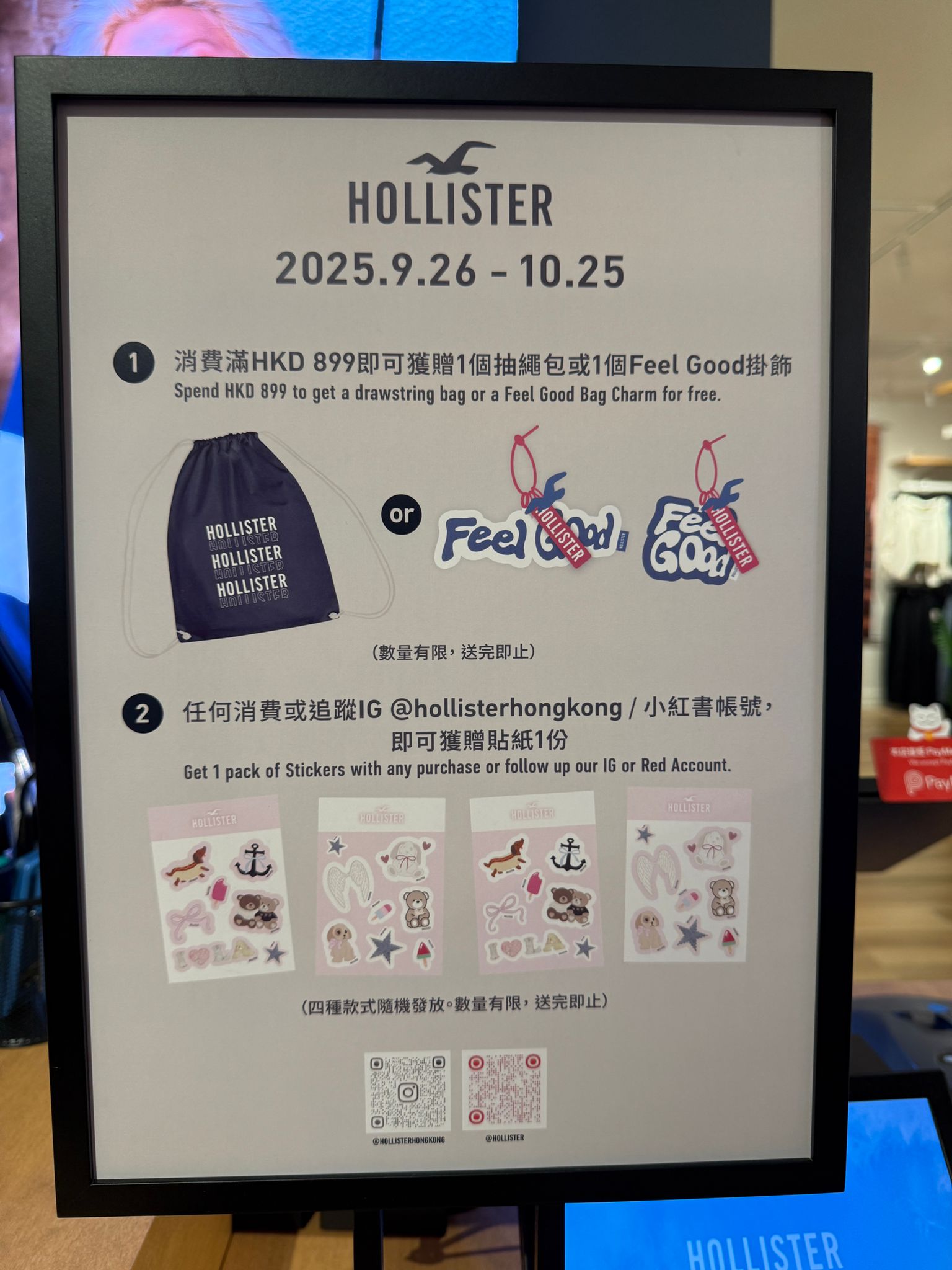 IG @hollisterhongkong 或小紅書 @HOLLISTER 帳號,即可獲贈隨機款式貼紙乙份。