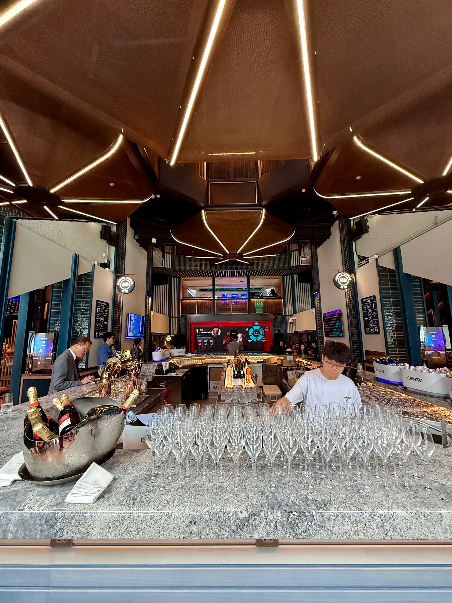 「天馬驛」延續上季在跑馬地馬場開幕的The Beat及Vantage的設計理念,以數碼化賽馬體驗為核心進行設施升級,例如三樓設有數碼亮相圈展示實物大小的電腦合成馬匹,以及三個互動式AI揀馬站透過震撼的即時視覺效果展示賽馬數據,以嶄新的科技提供無可比擬的賽馬互動,方便新一代馬迷深入感受賽馬的魅力。