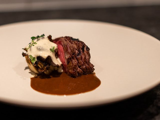 隨後是金針菇、大白菜及辣椒的素菜,展現獨特辣香;新鮮龍蝦則以柑橘及干邑白蘭地提升風味,令人陶醉。美味之旅繼續展開,橄欖和牛配以舞茸菇、烤馬鈴薯奶油及佩里格醬,肉質鮮嫩多汁;鴿子以血汁烹製,搭配李子,風味濃郁而平衡。晚宴以兩款精緻甜點作結:無花果搭配木槿花,清新雅緻;焦糖茴香乳酪蛋糕搭配白巧克力,甜而不膩,為這場味覺盛宴畫上完美句點。