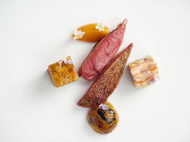 Uwe Opocensky主廚則以雪莉醋點綴的野生蘑菇塔、搭配北海道海膽配以茶碗蒸及酸橘,增添細膩口感。主菜包括油甘魚配以奧塞特拉魚子醬、香橙醋汁及昆布,鮮美奪目;鵝肝融入秋季梨子,溫潤細膩。
