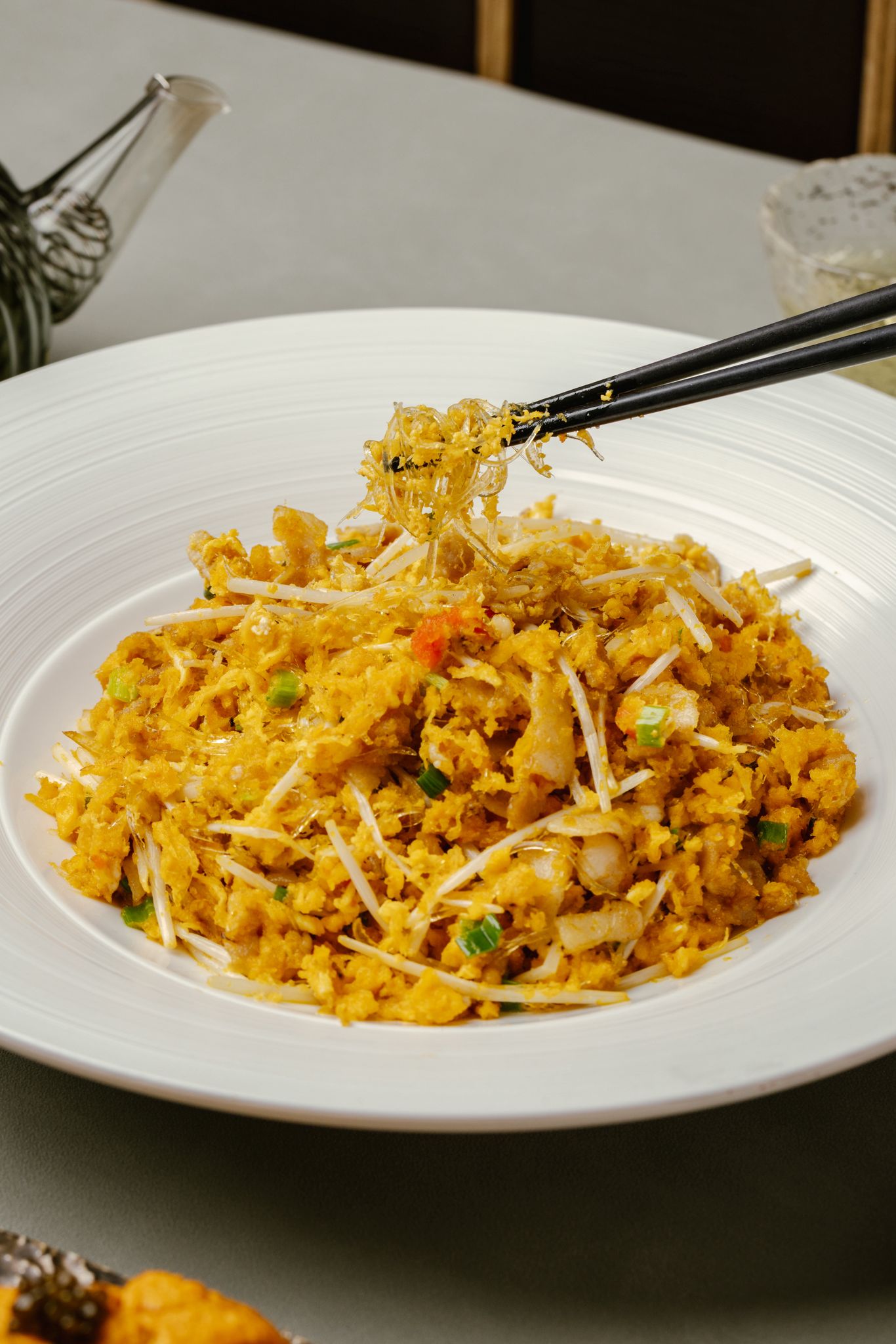 選用珍貴的魚翅與新鮮的蟹粉精心燴煮而成。魚翅保持了原有的細膩口感,而蟹粉則注入了濃郁的蟹香,徹底滲透於每根魚翅,配以雞蛋、蔥油、薑末及蟹肉絲,經高溫快炒,色澤金黃誘人。