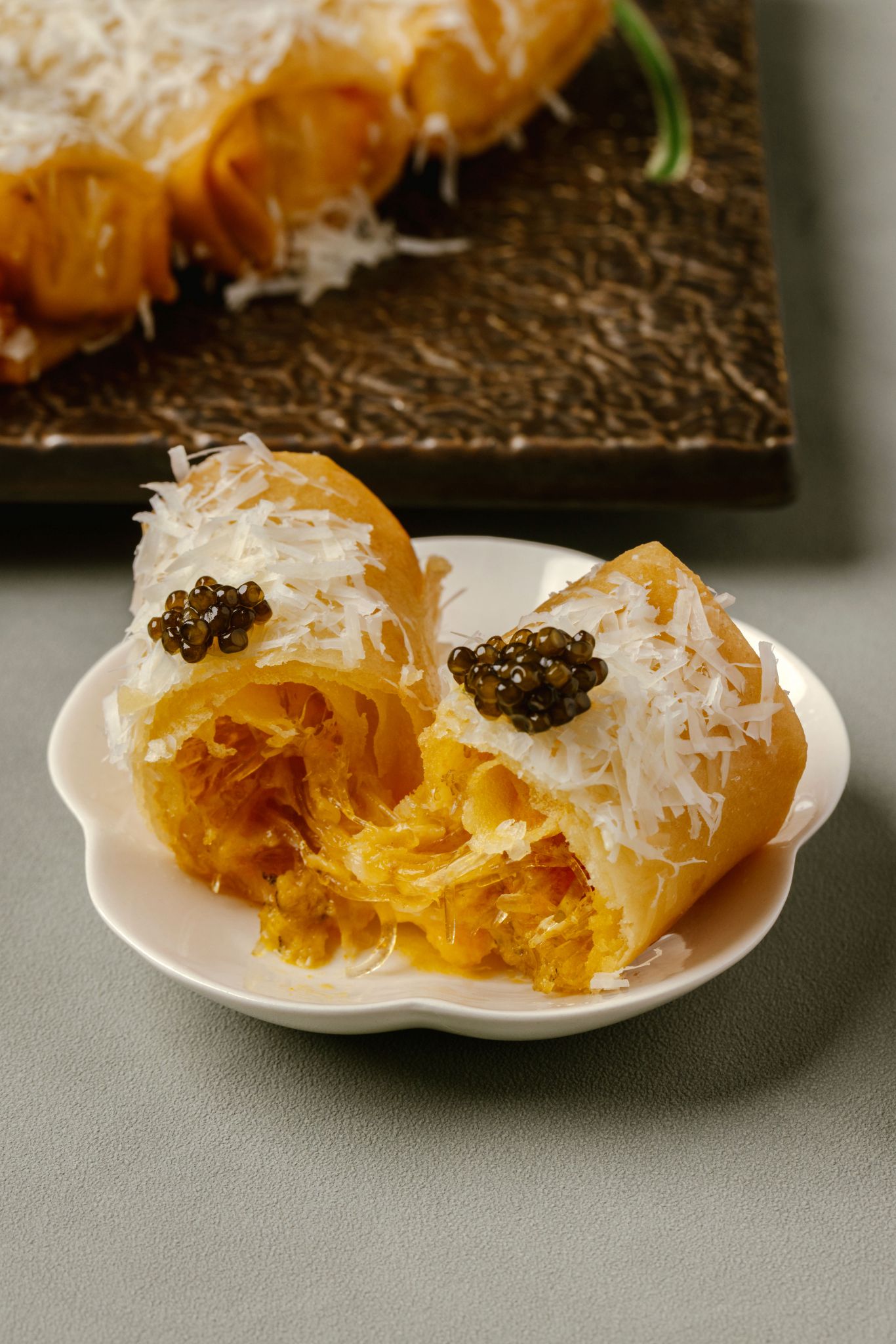 以法國魚子醬細緻點綴於表面,鹹香高雅,切開金黃酥脆春卷外皮,蟹粉與魚翅交融如絲,盡顯海味的鮮美層次,鮮美中蘊含奢華鹹香。