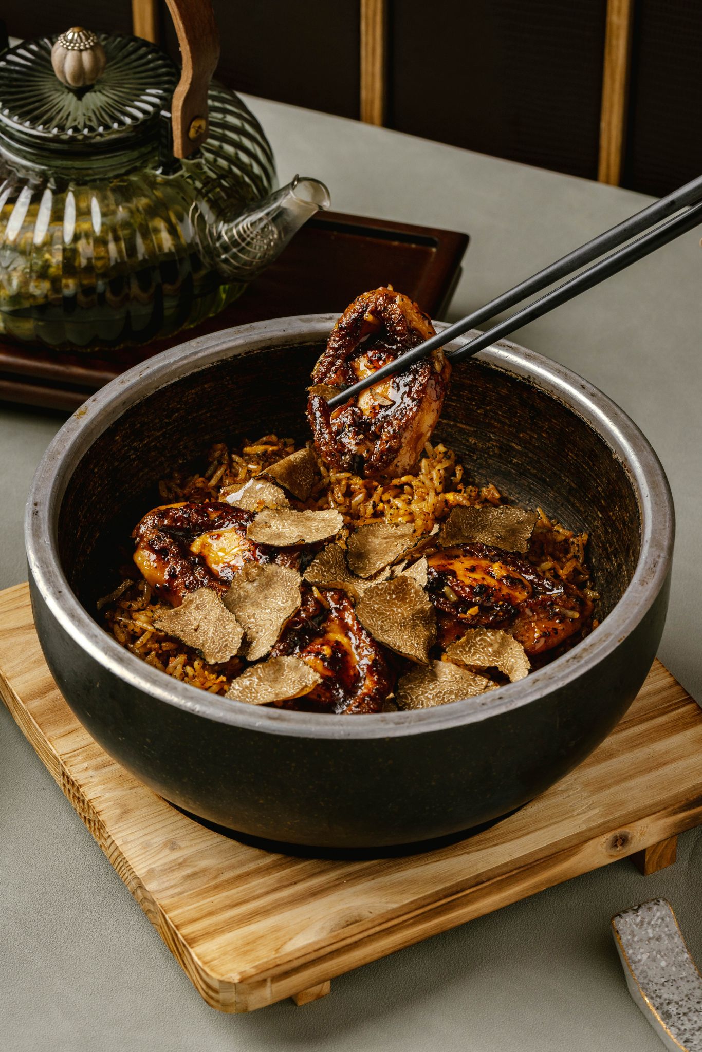 以鑊氣香米為基調,受熱後滿室生香,香米粒外層微脆、內裡柔韌。表層鋪上原隻細膩柔軟帶點嚼勁的鮑魚,搭配香氣悠長的黑松露。熱石鍋將鮑魚與松露的高雅氣息完美交融,彰顯高級食材的奢華質感。
