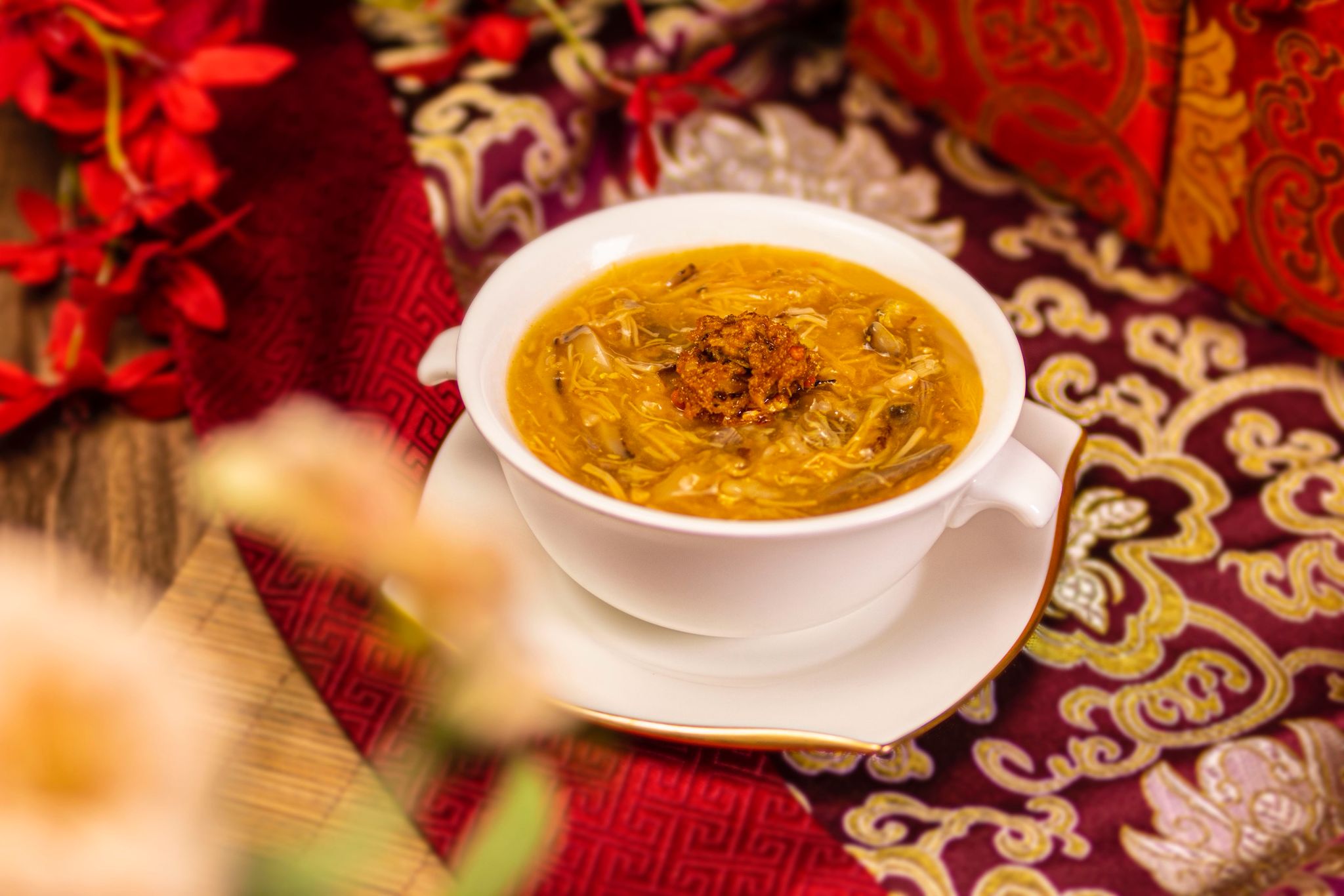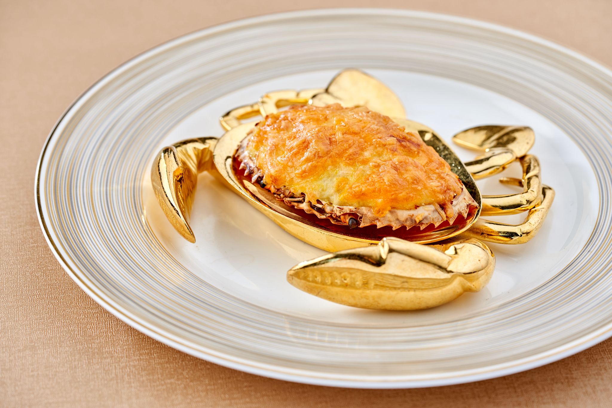 主廚精心挑選四兩半至五兩重的陽澄湖雄蟹,以紫蘇葉清蒸,白膏飽滿,完美保留蟹肉的鮮甜與細膩;芝士蟹粉焗蟹蓋則將生拆蟹肉與金黃蟹粉盛於蟹蓋之中,鋪上香濃芝士焗至微焦,香氣撲鼻;紅燒蟹粉瑤柱鴨絲羹以慢火熬製,湯色金黃,海鮮與蟹香交織出豐富層次;生拆蟹粉小籠包晶瑩薄皮包裹蟹粉與豬肉,湯汁飽滿,蟹香滲入肉中。