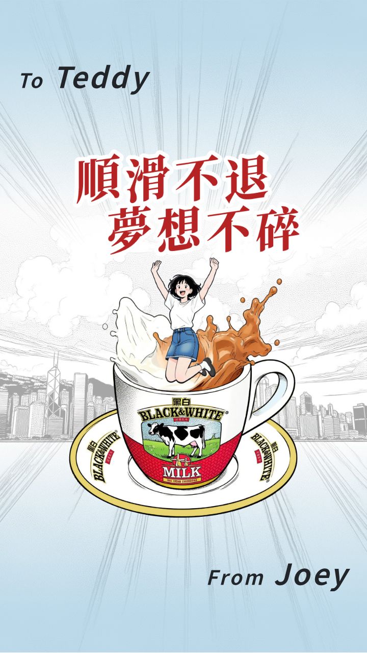 「黑白®打氣杯」特別採用高身設計(315毫升),杯身採用象徵港式奶茶文化的經典設計,印有荷蘭菲仕蘭乳牛的標誌圖案,並刻有正能量滿滿的「黑白®打氣字句」,為港人送上最窩心的支持!除了有獎遊戲外,參加者更可透過活動網站投選你最喜愛的「黑白®打氣字句」,並製作你的專屬「黑白®電子打氣卡」,為自己或身邊的好友送上窩心的支持。