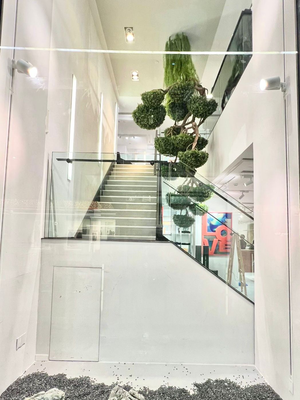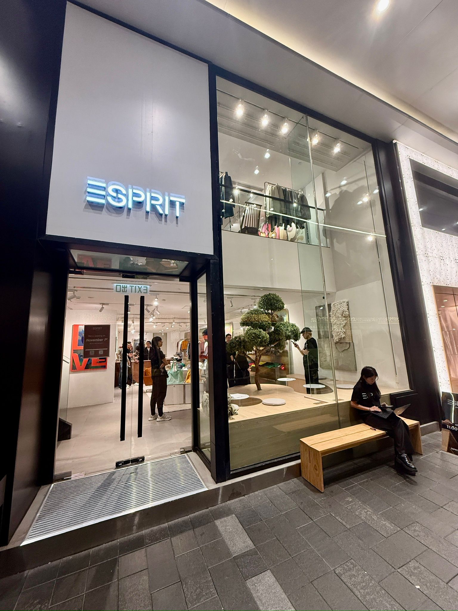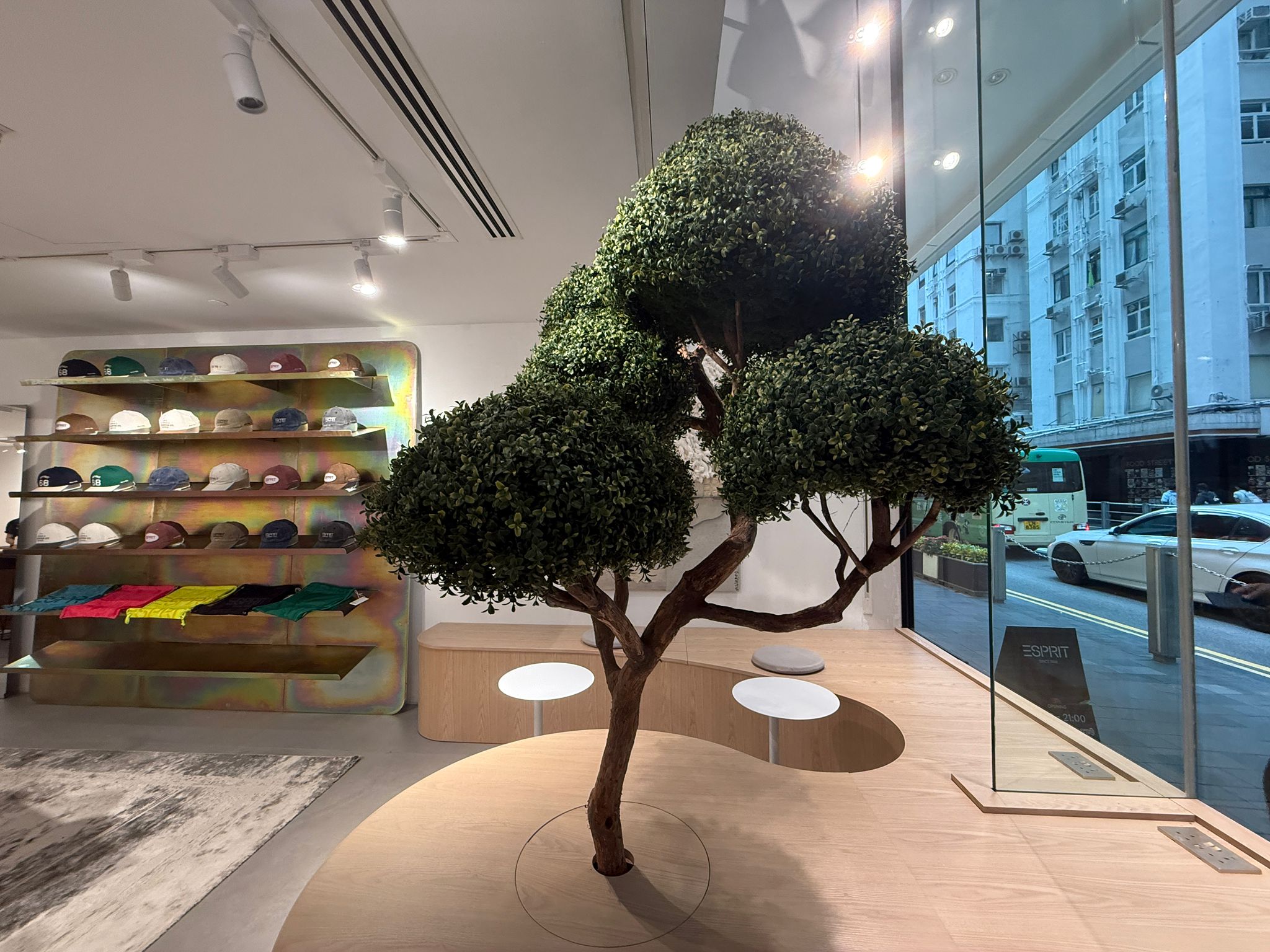 Esprit 銅鑼灣旗艦店打破傳統,將購物轉化為一趟「沉浸式藝術之旅」。店中央懸掛高達6.5米的「倒掛樹(Inverted Tree)」成為品牌全新地標裝置。這株違反重力的雕塑以輕質碳鋼及霧面葉片打造,如「漂浮的綠色奇境」,成為跨樓層的地標級視覺焦點。