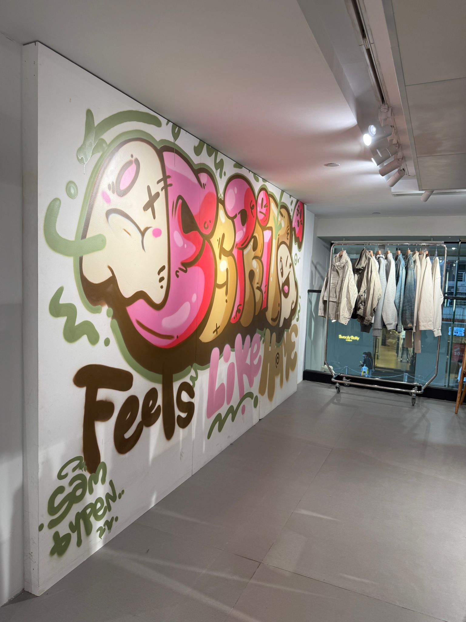 1/F|Urban Street Zone展出 Edition Series 與 Accessories 系列,Edition 系列搭配 Art Deco 傢俬與金屬掛架展出;韓國塗鴉藝術師 Sambypen 手繪15呎塗鴉牆成為樓層視覺亮點,重塑街頭藝術與時尚的連結。扶手梯轉角處延伸種植倒吊琴葉榕植物,形成地面與空中自然對應,呈現生態與藝術兼容的視覺層次。