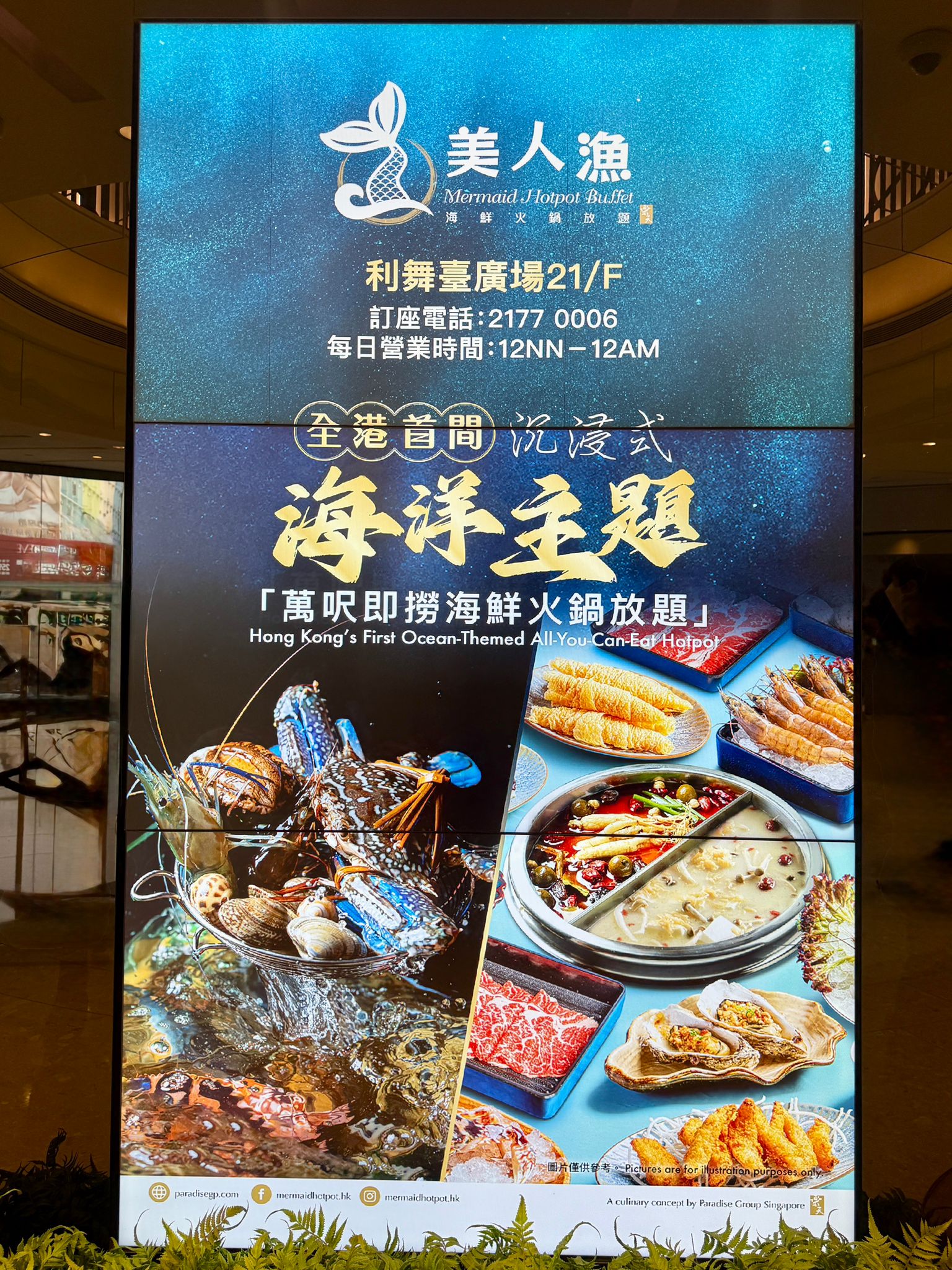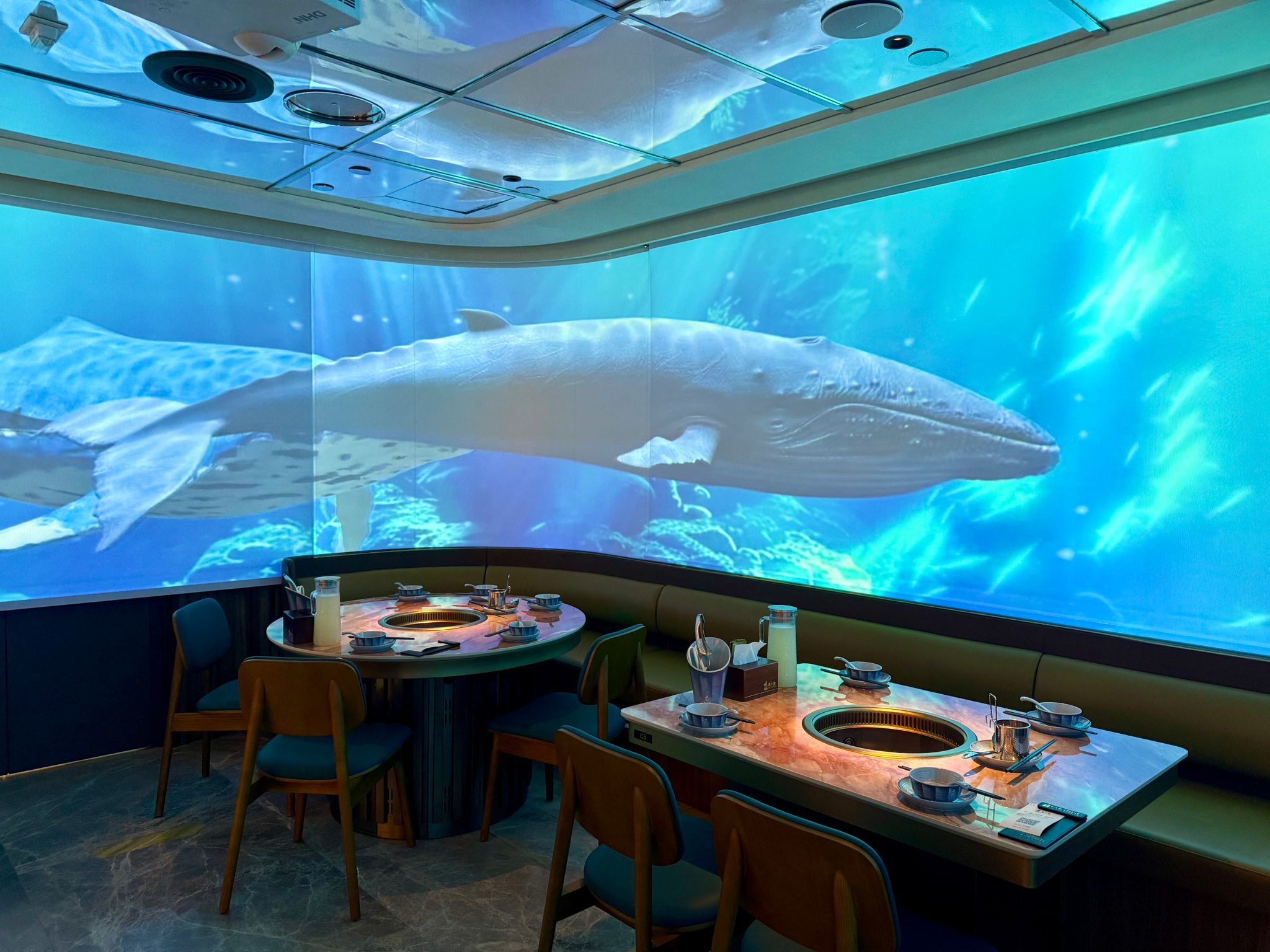 「美人漁」即撈海鮮火鍋放題店主打沉浸式投影與環迴聲效系統構築出動態的「海洋劇場」,使人仿若與海洋生物共舞於過萬呎的藍色世界。