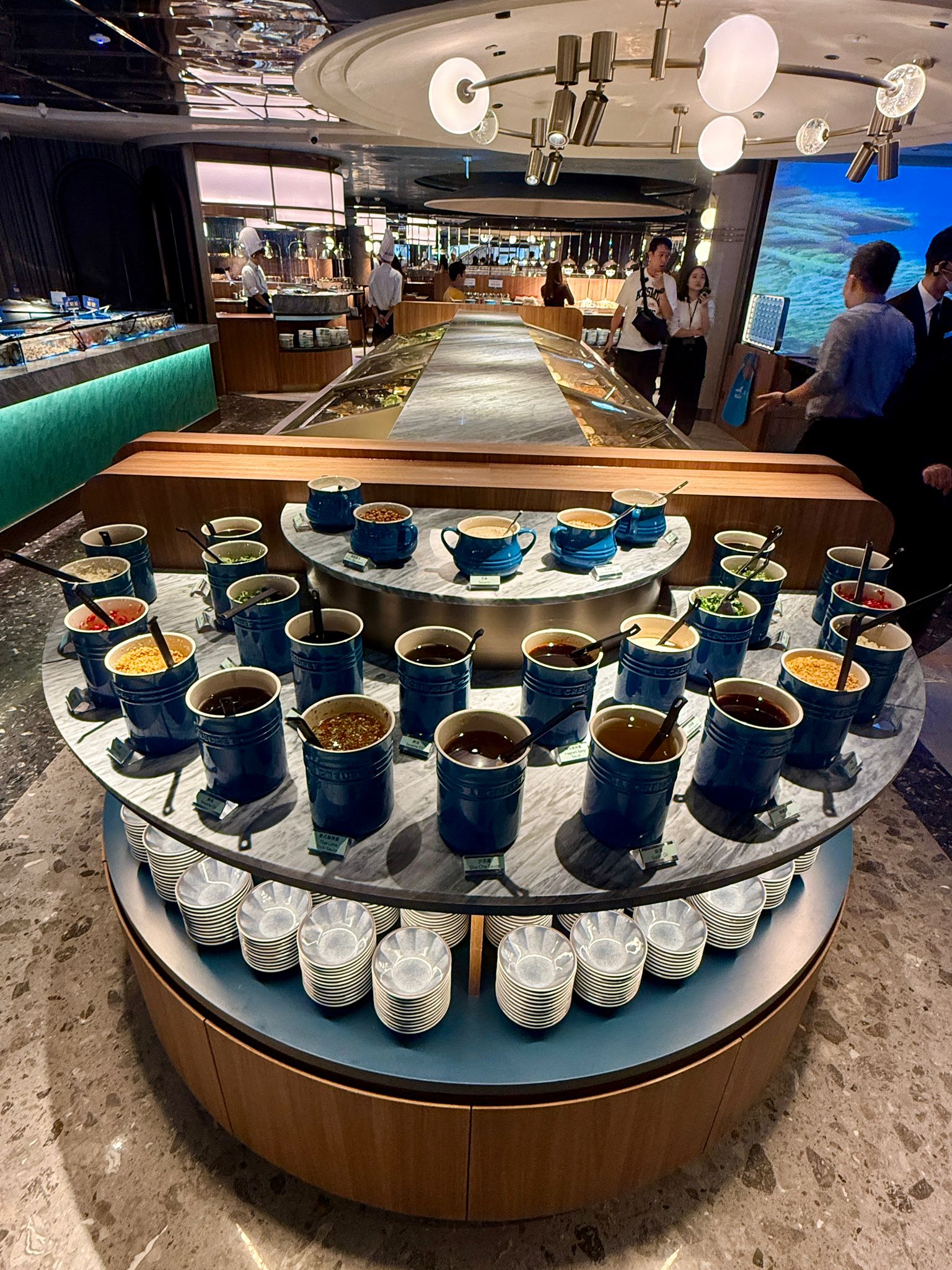 四個主題自助區分別圍繞中庭展開,包括活海鮮區、燒烤熱葷區、自家製環球及香港特色甜品區,以及醬料配菜與沙律區,連結不同的味覺體驗。餐廳內更設有多款私人包廂,分別可容納14、32及66人。