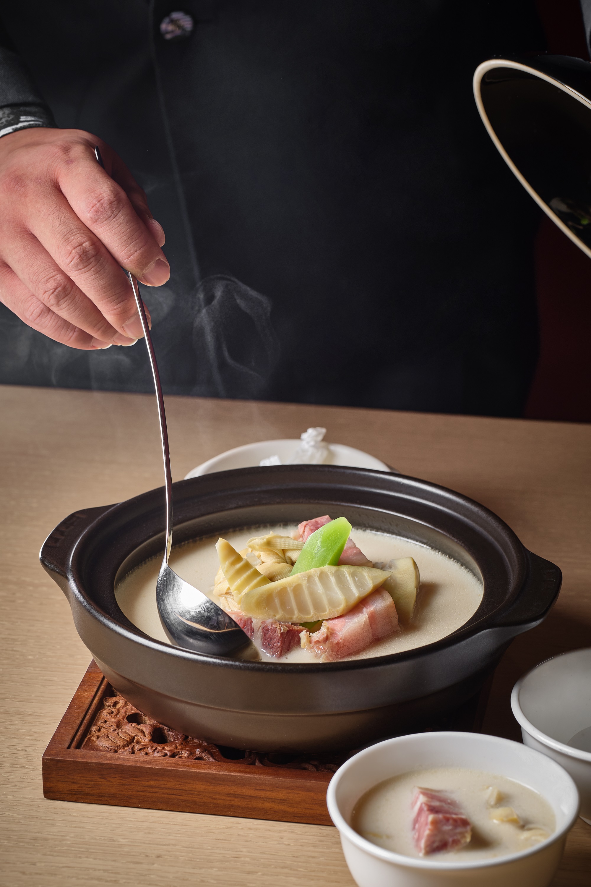 以新鮮五花與鹹肉慢火同燉,熬出醇厚乳白底湯後,加入春筍與萵筍增添清甜味道,百葉結吸飽湯汁,鹹香中透著筍香清雅,滋味醇厚。