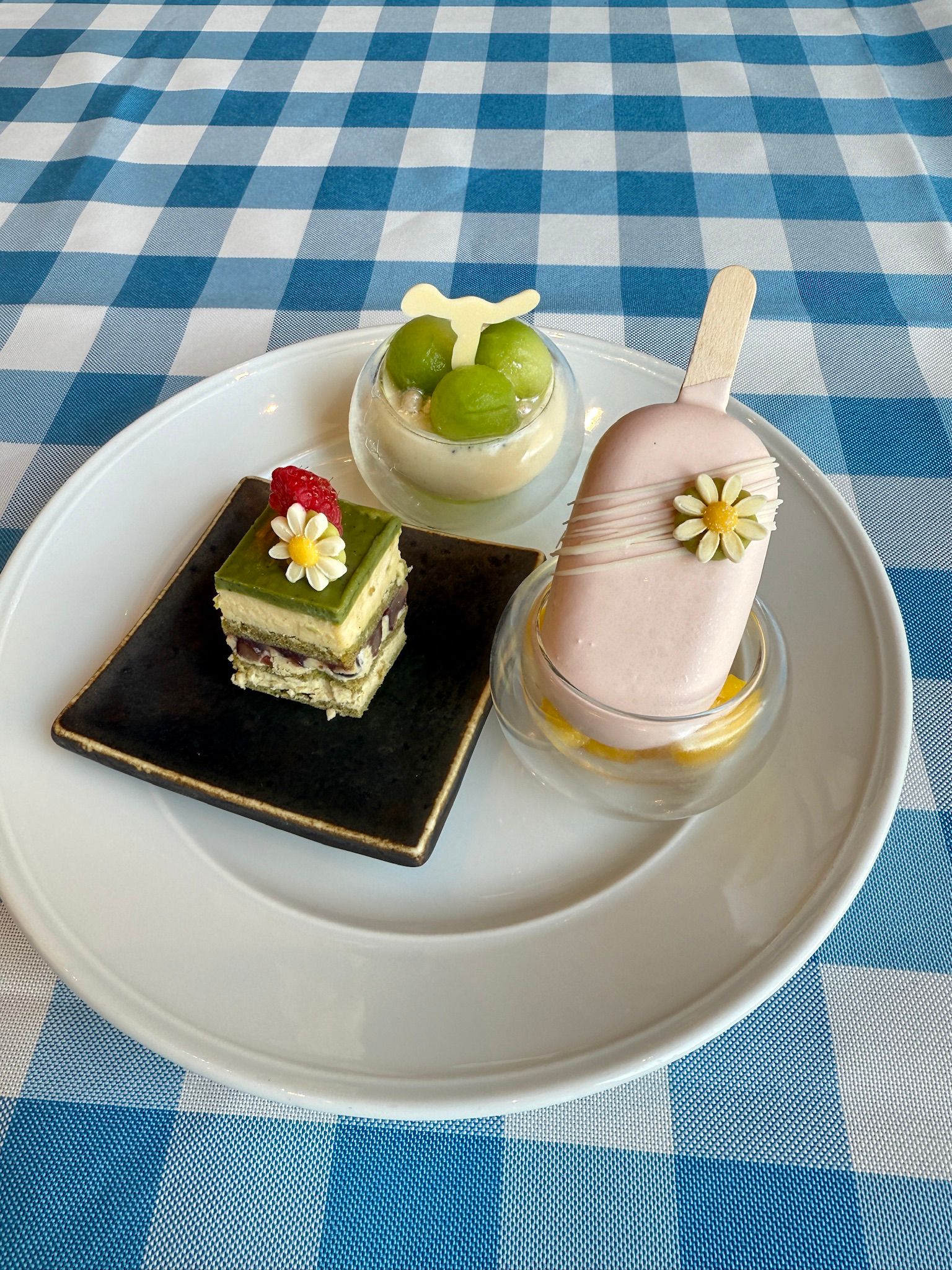 如茉莉綠茶紅豆歌劇院蛋糕、蜜餞黑胡椒熱帶水果慕絲棒、鮮無花果和士多啤梨布頓撻,