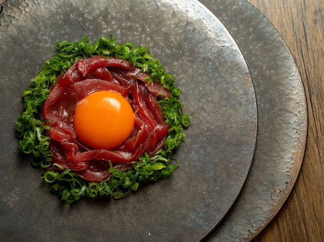 以手切藍旗吞拿魚蓉為主角,混合少許醬油與香油調味,中央覆上一顆橙黃飽滿的日本蛋黃,拌勻後更添濃郁圓潤的口感,鹹香之中帶著蛋黃的溫潤。