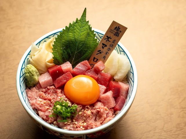 專為吞拿魚愛好者而設,來自豐洲市場、 由山幸直送的角切本鮪赤身、中拖羅與手切吞拿魚蓉 (Negitoro)依次排開,紅潤光澤、脂香馥郁,在赤醋飯 上交織出濃郁海味。搭配上日本蛋黃,瞬間增添了香濃和滑順的口感,視覺與味覺同樣滿足。