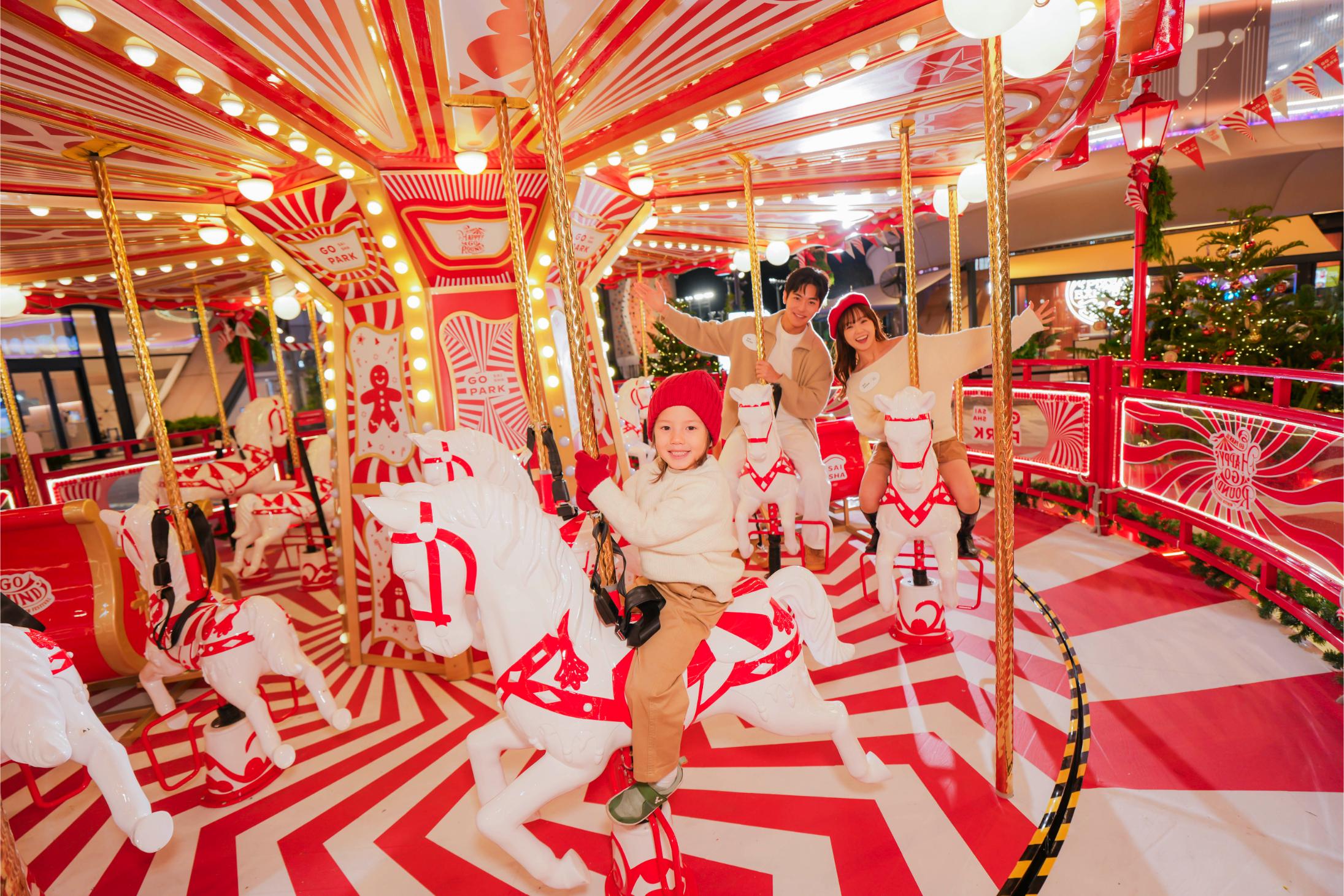 一家大細不妨結伴倚坐超巨型戶外真.「炫夢旋轉木馬」,除可坐上木馬上迴旋360度細看迷人美景外,更可仰望欣賞炫亮閃爍燈海,配上節日感滿滿的音樂,浪漫氣氛滿溢!