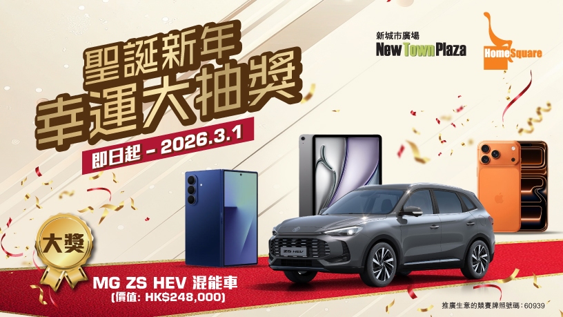 「聖誕新年幸運大抽獎」,即日起至 2026 年 3 月 1 日於新城市廣場或 HomeSquare 「即賺分」的商戶,每張即日電子單據消費滿 HK$500 即可登記積分及獲得抽獎機會 1次 ,每張單最多獲 10 次抽獎機會,獲抽中的幸運兒有機會獨得 MG ZS HEC 混能車、 iPhone 17 Pro Max 512GB 及 Samsung Galaxy Z Fold 7等!