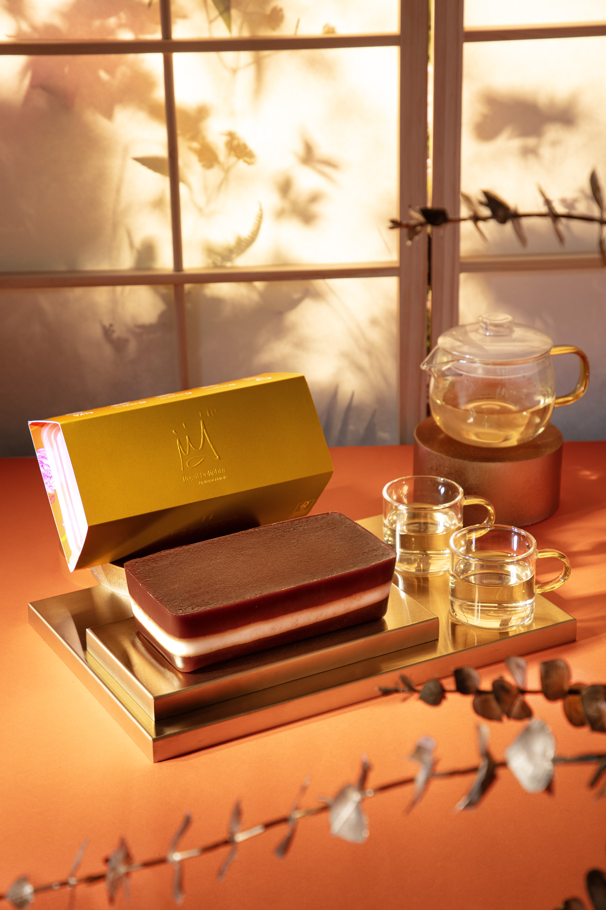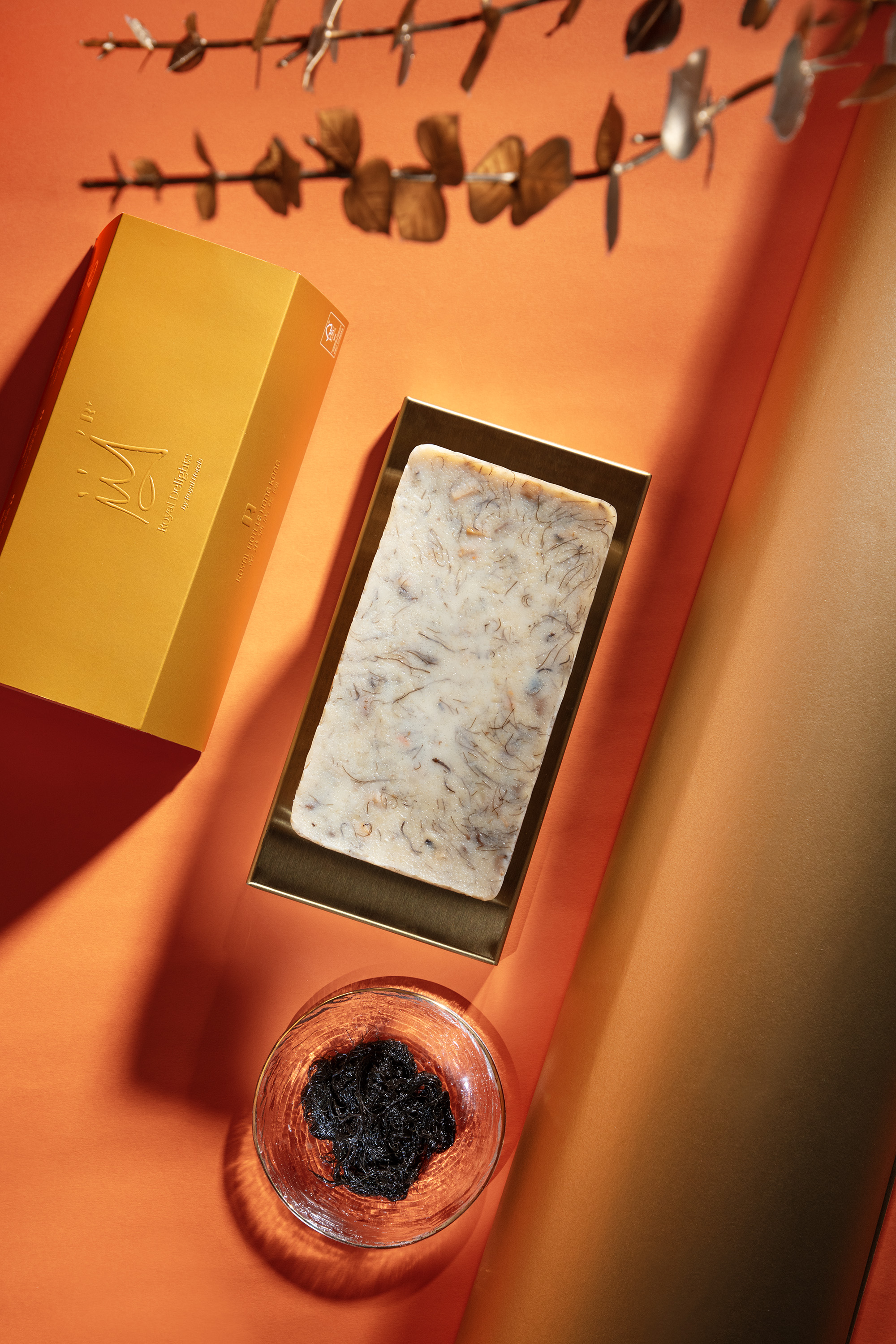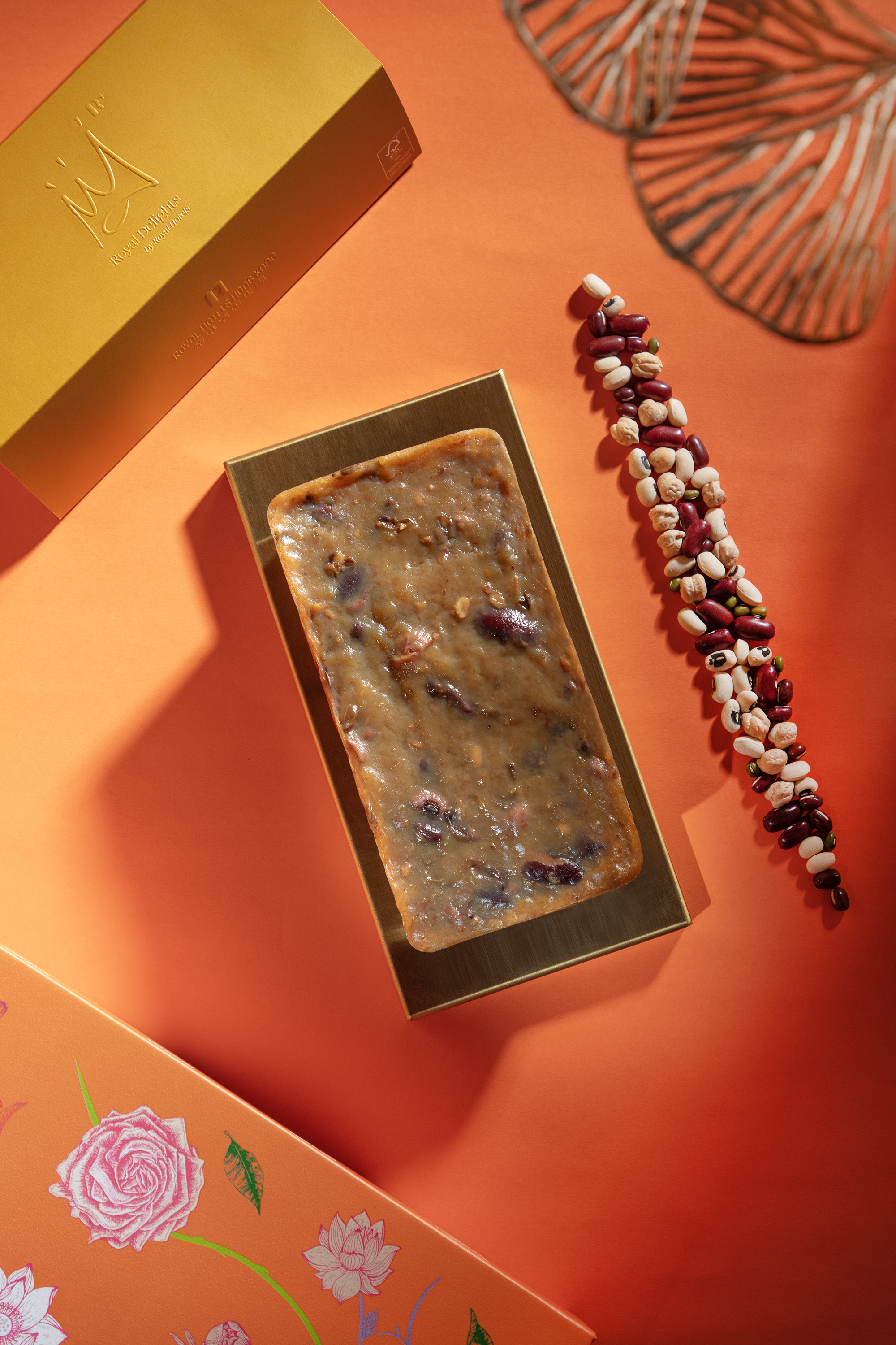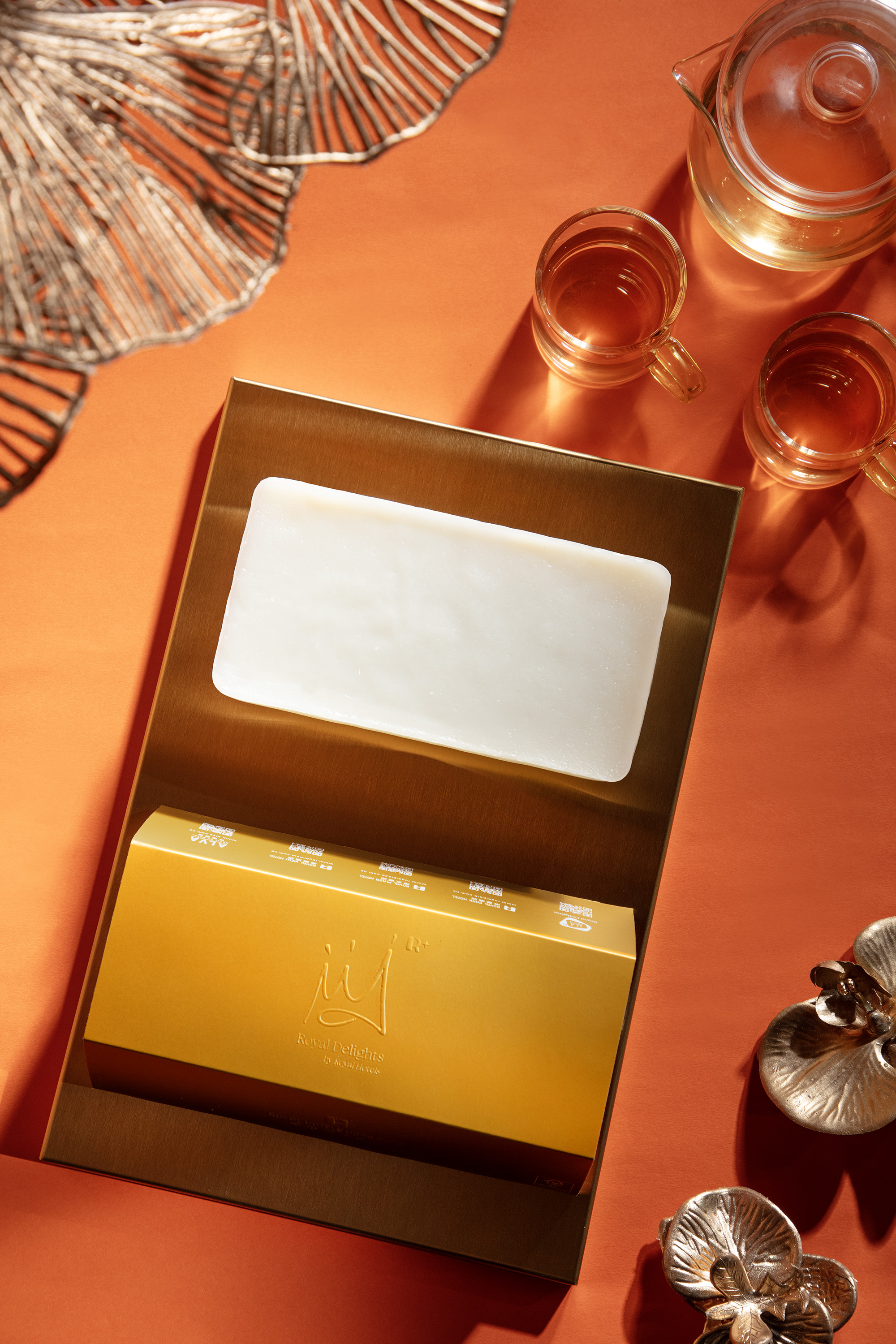 精選碩大飽滿、棗味濃郁的新疆天山雪棗,炮製成上層及底層的香甜紅棗糕,兩層之間加入桂圓椰汁糕,帶來清甜不膩的味道,面層綴上金箔,增添了矜貴的感覺。