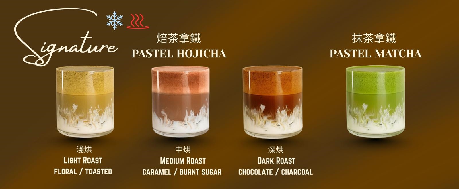 全線產品均使用獨家研發的配方,其中招牌「Pastel系列」提供三款不同焙度的茶粉選擇:淺焙散發清新花香,中焙帶有濃厚焦糖香,深焙則蘊藏深邃炭香,帶您完整體驗焙茶的風味精髓。另設抹茶拿鐵,呈現清雅與柔滑並存的經典口感。有別於一般店鋪僅以水沖開茶粉,全線系列均統一採用優質燕麥奶作為基底。此舉無需額外加價,只為讓每一杯飲品的口感更顯豐郁綿滑,完美襯托並昇華焙茶的獨特香氣,亦配合現代健康飲食趨勢,適合乳糖不耐症的大眾顧客。