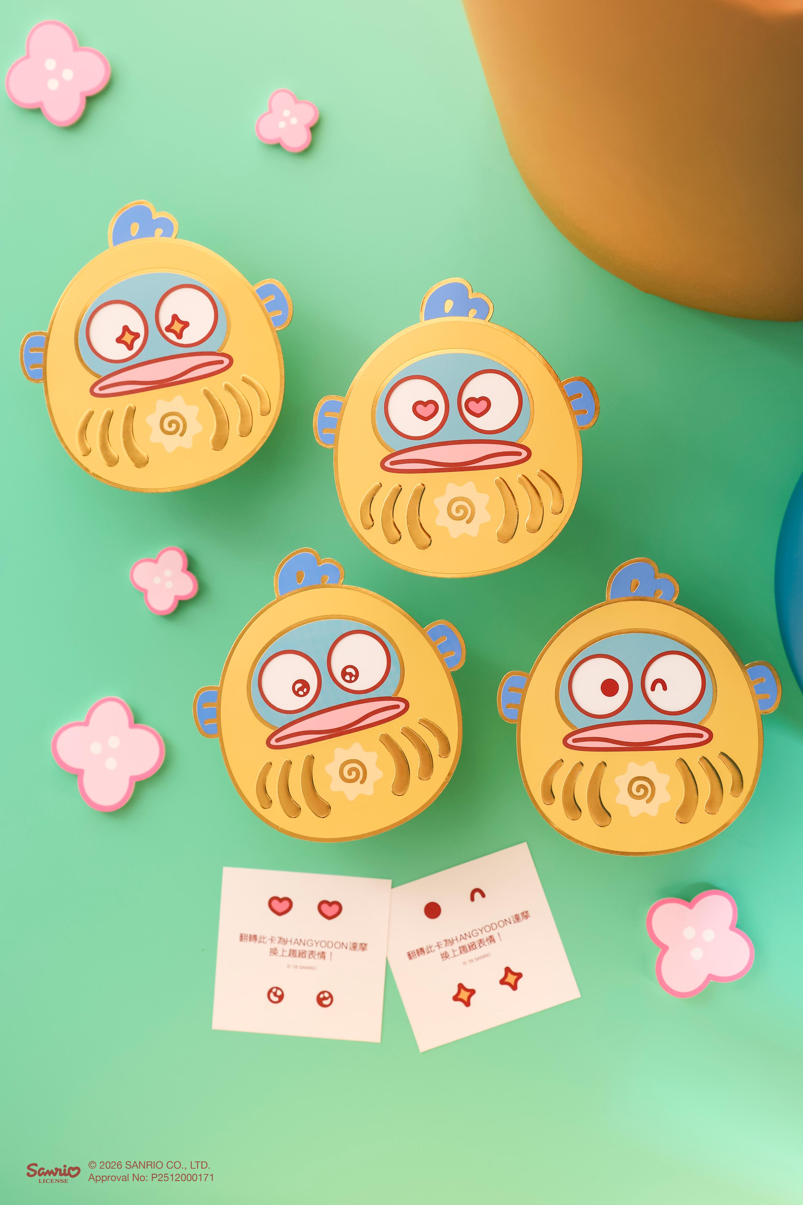 此設計概念源自日本傳統文化中「達摩點睛」的許願和還願習俗;每款眼神都蘊含不同的新春祝願:「愛心眼」象徵愛心滿溢、心想事成;「亮晶晶眼」代表滿心幸福、溫馨洋溢;「醒目wink眼」展現精靈活潑、聰明伶俐;而「閃閃星星眼」則寓意吉星高照、順風順水,由派發者親手換上更顯心意誠摯,收禮者願望必達!