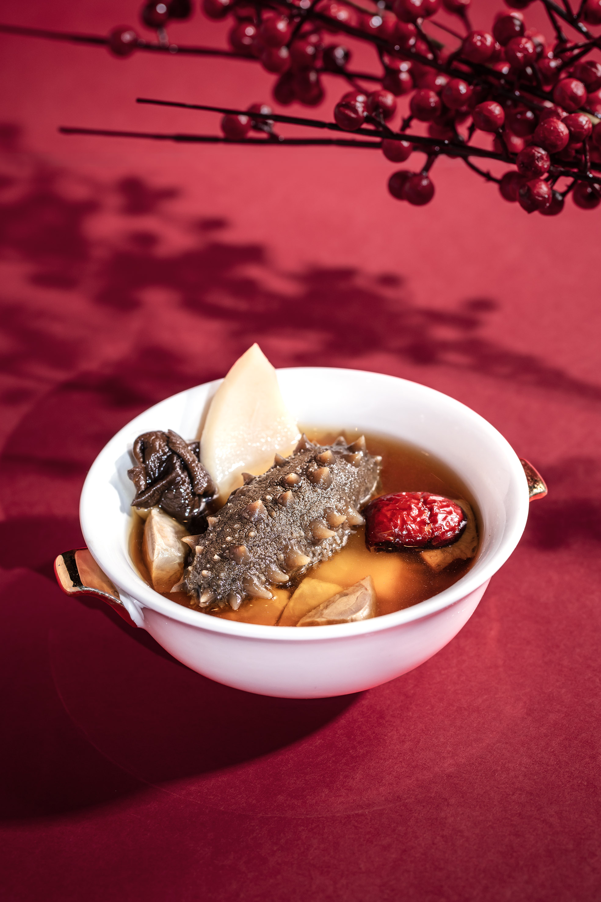 糅合傳統與創意,區域中式廚藝總監江肇祺師傅以喜慶為設計基調,加入各款意頭食材烹調而成,用料包括頂級六頭湯鮑魚、蝦籽花膠、日本宗谷元貝、乾燒虎蝦等;亮點是大廚的秘製醬汁,用上鮑魚汁、南乳、柱侯醬等調製而成。當中的鮑魚汁先以赤肉,鮮雞、瑤柱等材料熬煮4小時,味道濃郁,之後加入南乳、柱侯醬及雞湯等調配而成。
