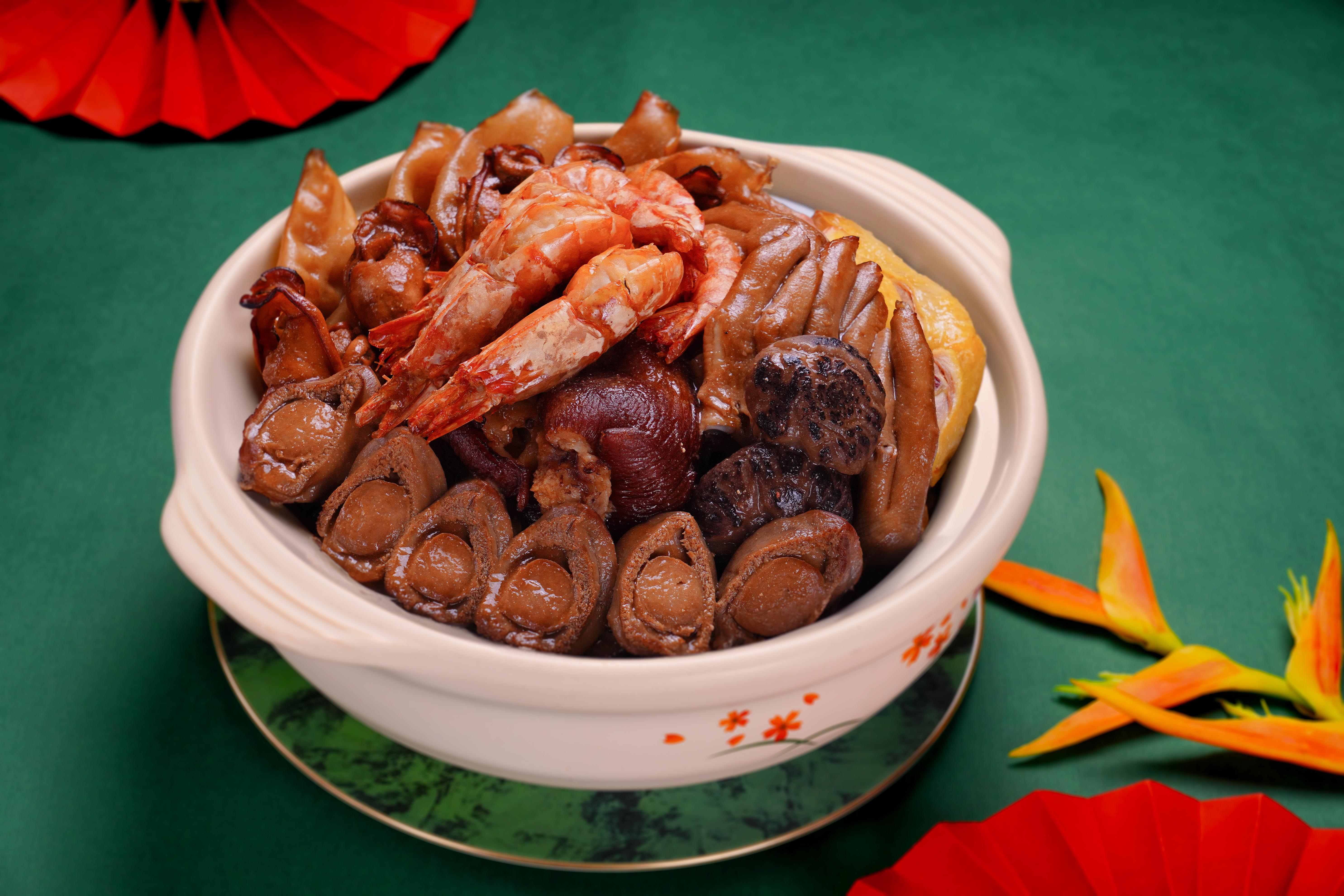 八頭鮑魚象徵富貴圓滿;花膠寓意安康富泰;秘製蠔豉代表金玉滿堂、好事連連;鮮甜虎蝦,寓意笑口常開;南乳豬手經長時間炆煮至軟糯,象徵事事順利、手到拿來;玫瑰豉油雞保持原汁原味,傳承粵式經典;鮑汁扣鵝掌以濃郁鮑汁慢火浸煮,寓意鴻運當頭。配以大花菇、大根蘿蔔片、公館芋頭片、蓮藕片與娃娃菜,象徵好彩頭、好頭好尾、連連有餘與欣欣向榮。