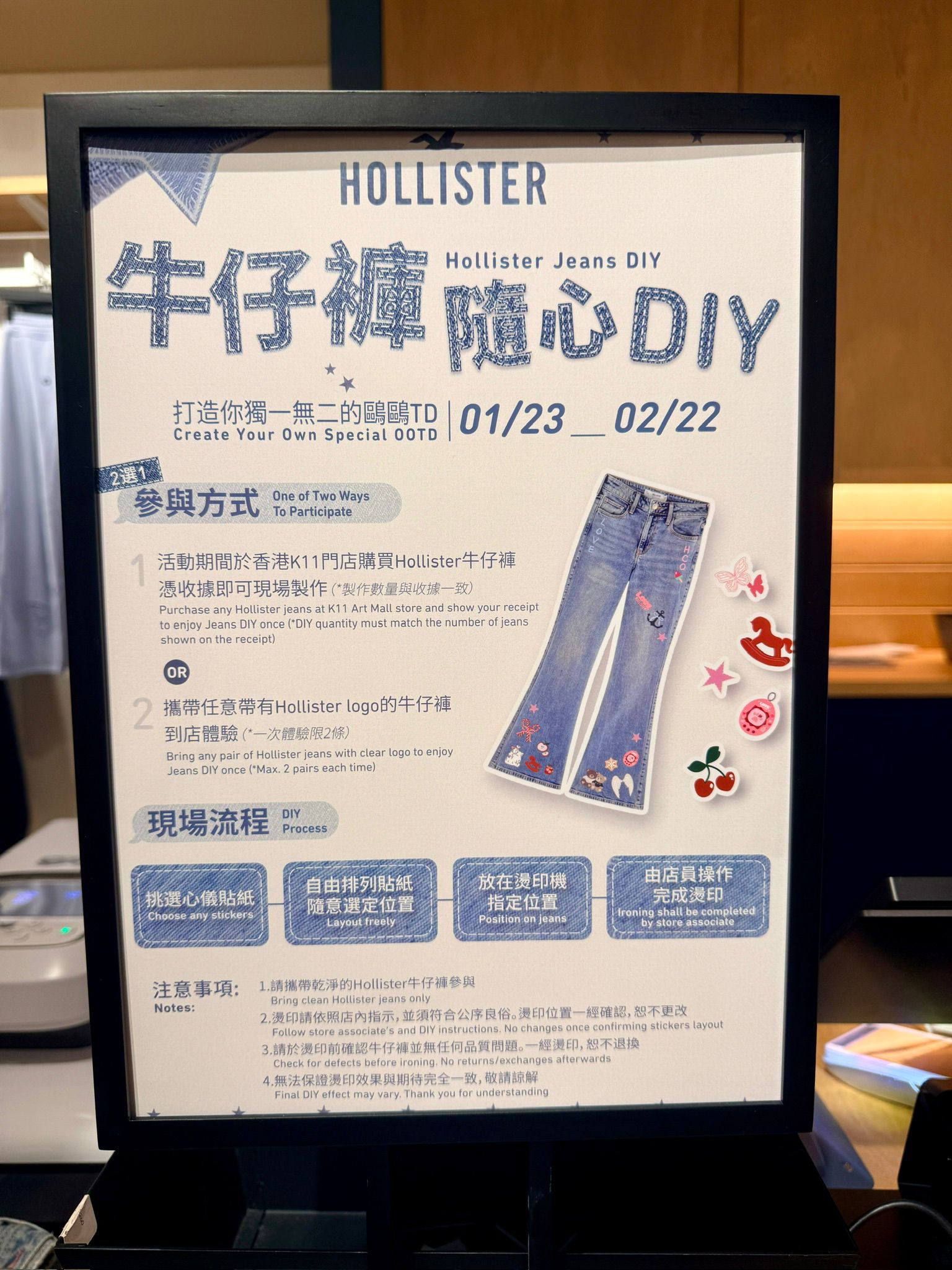 新店開張限時活動,由即日至2月22日開幕期間,消費者於店内憑購買任何一條牛仔褲產品的收據,或攜帶已有的 Hollister 牛仔褲單品,即可現場體驗DIY貼紙燙印活動。