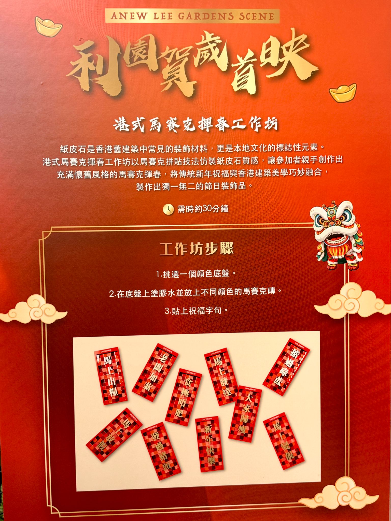 利園二期設有豐富親子活動,包括專為兒童而設的「菲林糖果盒」賀年行大運、馬賽克新式揮春及獅頭彩繪新春工作坊。