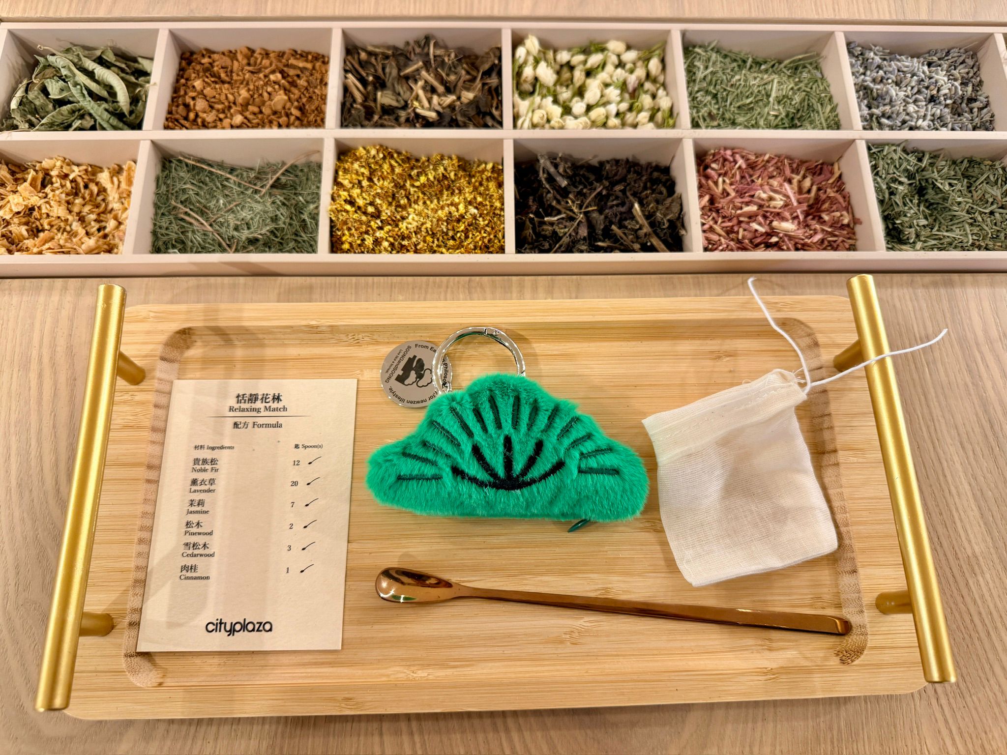 為了推動可持續發展,商場將聖誕佈置的聖誕樹交由香公所升級再造成其中一種香材「貴族松」,參加者可親手觸摸並細嗅多款天然香材,除了「貴族松」外,更有多款香草、花材及木本植物等原材料,參加者可從12款天然香材中調製出獨一無二的專屬香氣組合,投入香氣創作的趣味。