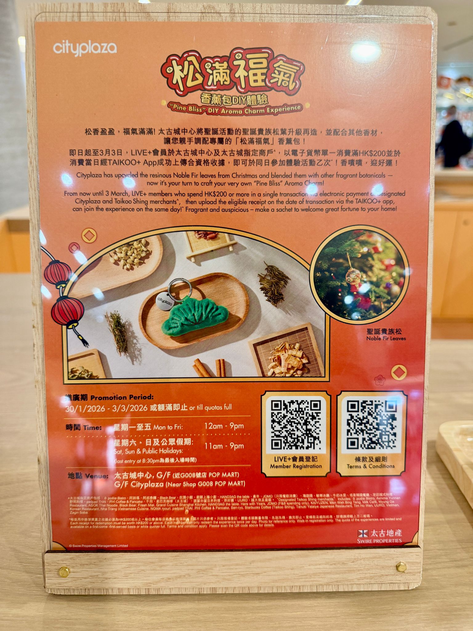 即日起至3月3日,LIVE+會員於太古城中心及太古城指定商戶,以電子貨幣單一消費滿HK$200並於消費當日經TAIKOO+ App成功上傳合資格收據,即可於同日參加及享受配製青松造型香囊鎖匙扣的樂趣。