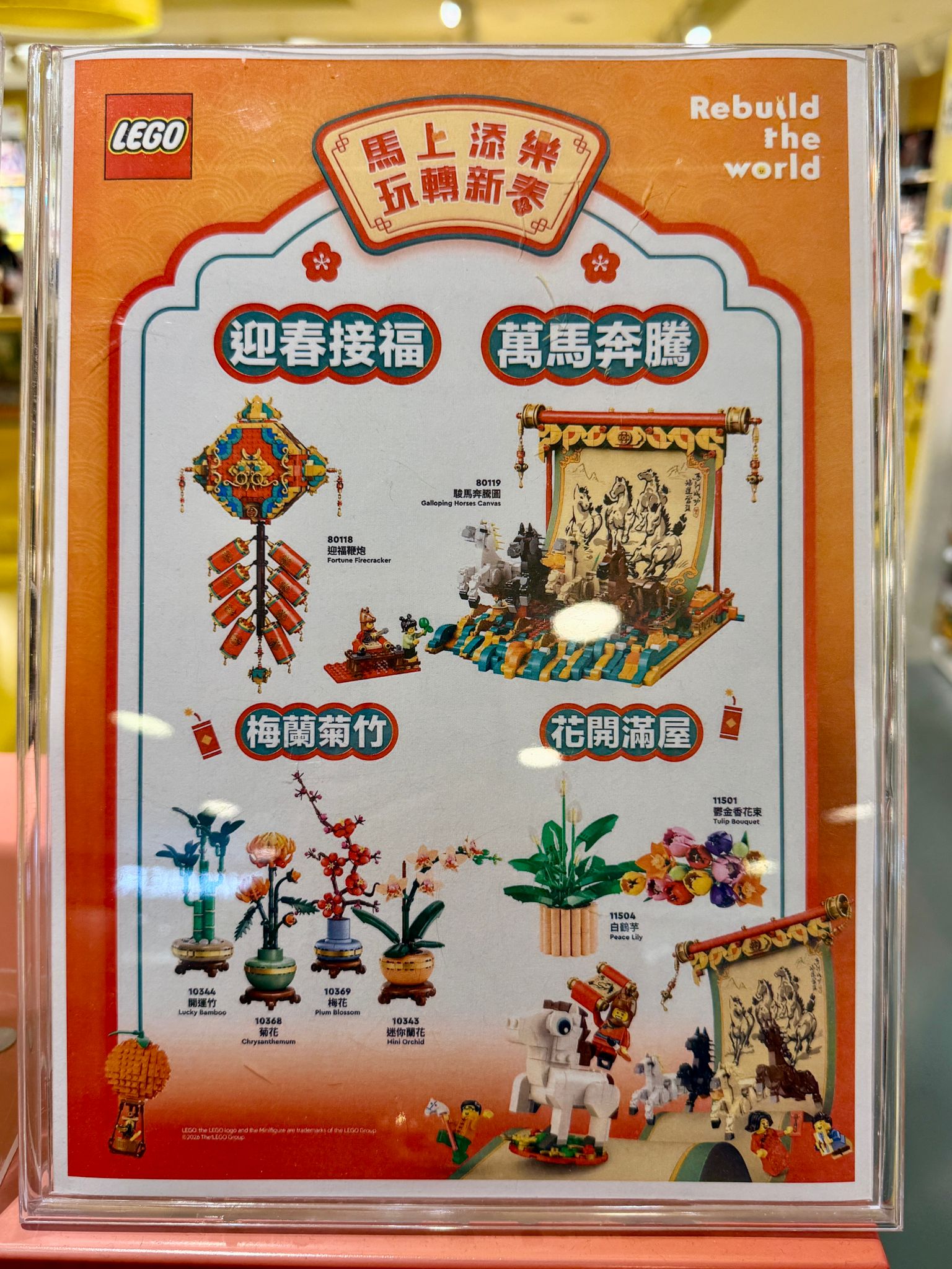 2026 年 1 月 9 日至 2 月22 日期間,凡於 LEGO® 認證專門店購買任何盒組滿$250,即可獲贈 LEGO® 新年限定利是封(8個) 乙套;滿$500,即可獲贈 LEGO® 新年賀年馬咕0臣乙個;滿$800,則可獲贈 LEGO® 賀年馬(40779)乙盒。數量有限,送完即止。