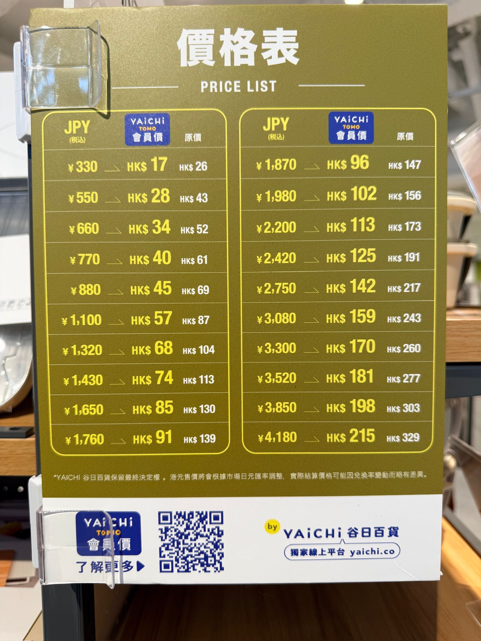 同時,YAICHI亦因應日圓兌港元匯率變動對整體價格結構作出調整。過往為 HK$18 的 330 日圓商品,在新定價下,會員可享優惠價 HK$17,這亦意味著會員將可以更具吸引力的價格,在香港選購高品質的日本生活用品。至於非會員,相關商品價格亦將作出相應調整,330 日圓商品的售價為HK$26。