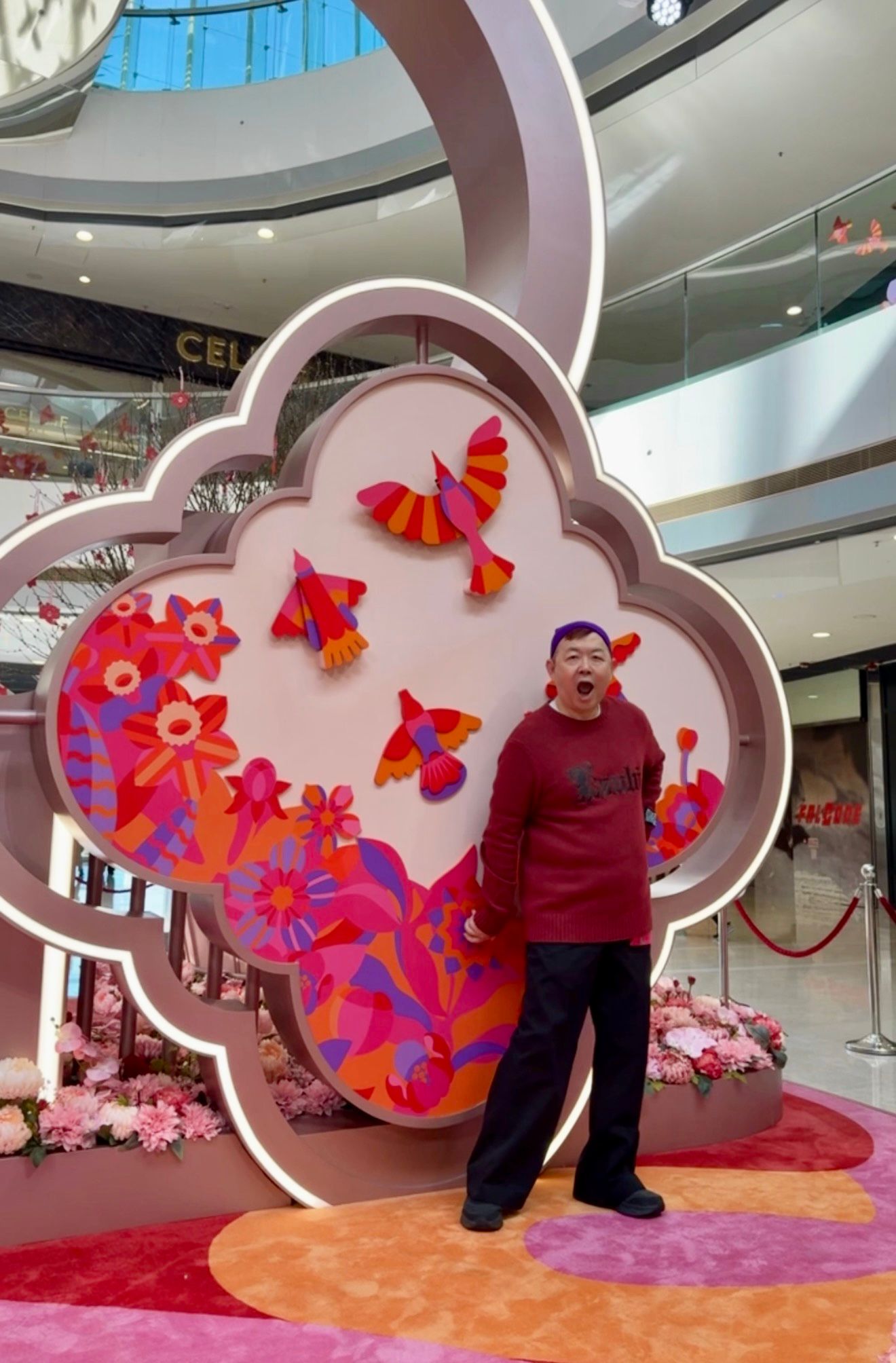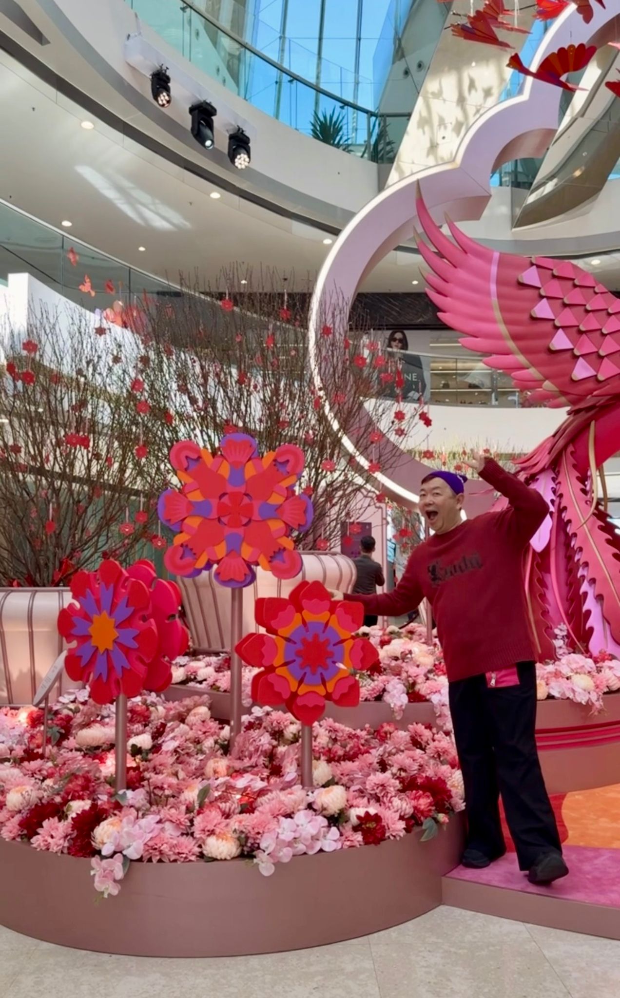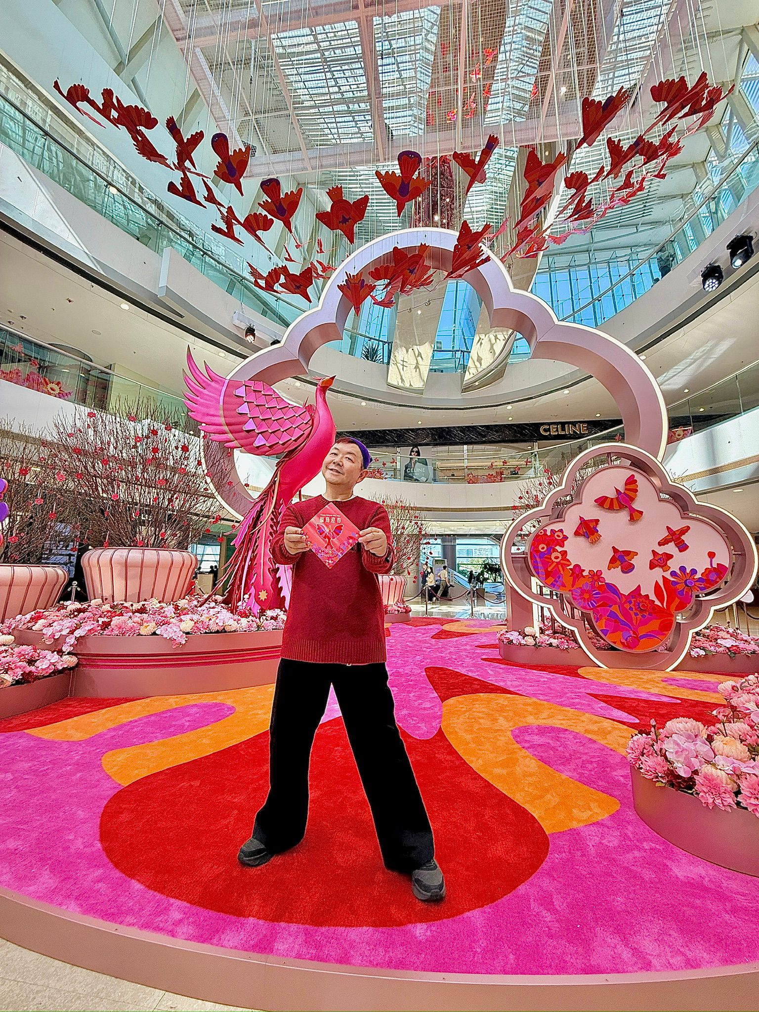 4米高的祥瑞鳳凰優雅矗立於商場中庭,百隻色彩繽紛的幾何造型飛鳥展翼盤旋,紛紛朝鳳凰翩然飛舞,象徵團圓焕新與昌盛繁榮的美好願景。