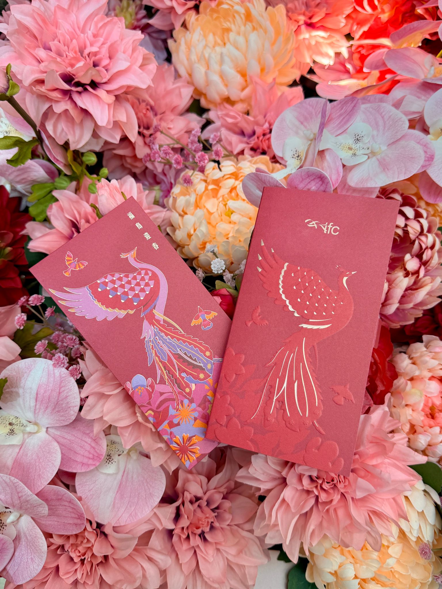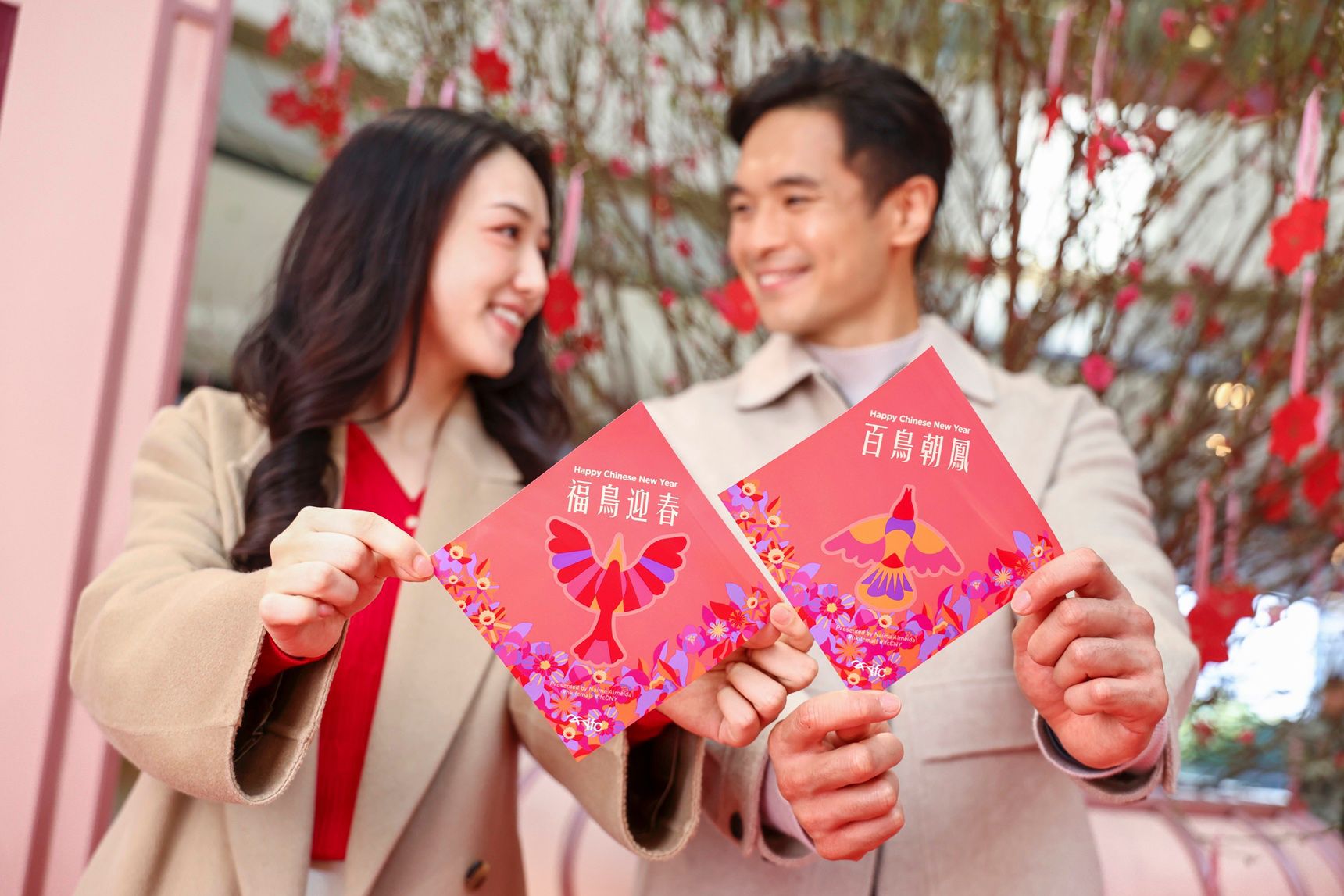除了「百鳥朝鳳迎新春」藝術裝置,巴西著名藝術家 Naíma Almeida 亦特別設計了「福鳥迎春」賀年利是封,以熾烈朱紅與喜慶的鮮豔色彩,綴以精緻立體燙金工藝,將奢華質感與現代美學交融生輝。藝術家將傳統祥瑞的鳳凰與飛鳥意象,轉化為流暢靈動的幾何線條,與綻放花卉交織,寓意團圓聚福、萬象新生、昌盛騰飛,並寄願新春福運如繁花盛放、似飛鳥翱翔。