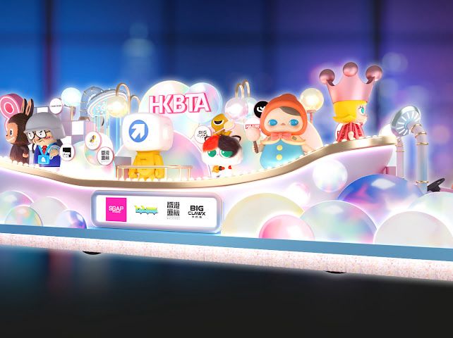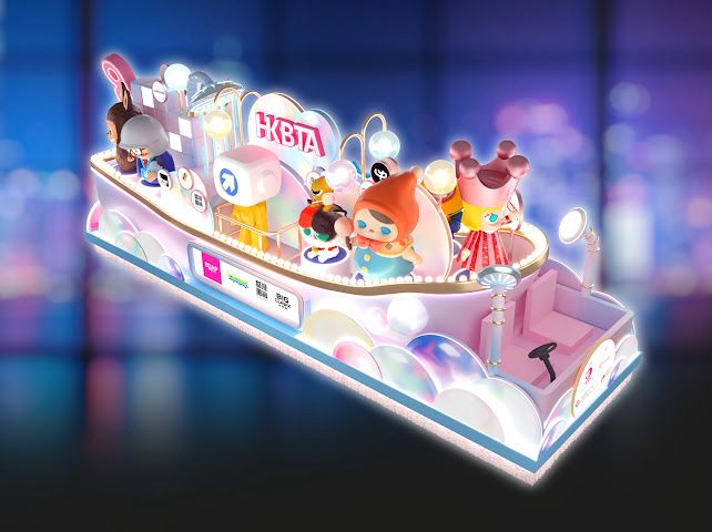 「香港潮流玩具花車」以泡泡浴缸為設計概念,吹出創意泡泡,寓意孕育靈感。花車以夢幻粉色為主調,10 米長、4 米高,糅合精心設計的幻彩燈光與音效,打造出一座流動的玩具藝術展館。