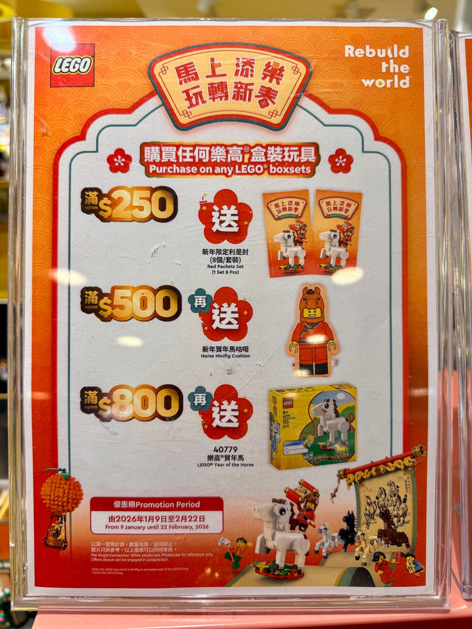 1 月 9 日至 2 月 22 日期間,凡於樂高®認證專門店購買任何盒組滿$250,即可獲贈 LEGO 新年限定利是封(8 個) 乙套;滿$500,即可獲贈 LEGO 新年賀年馬咕