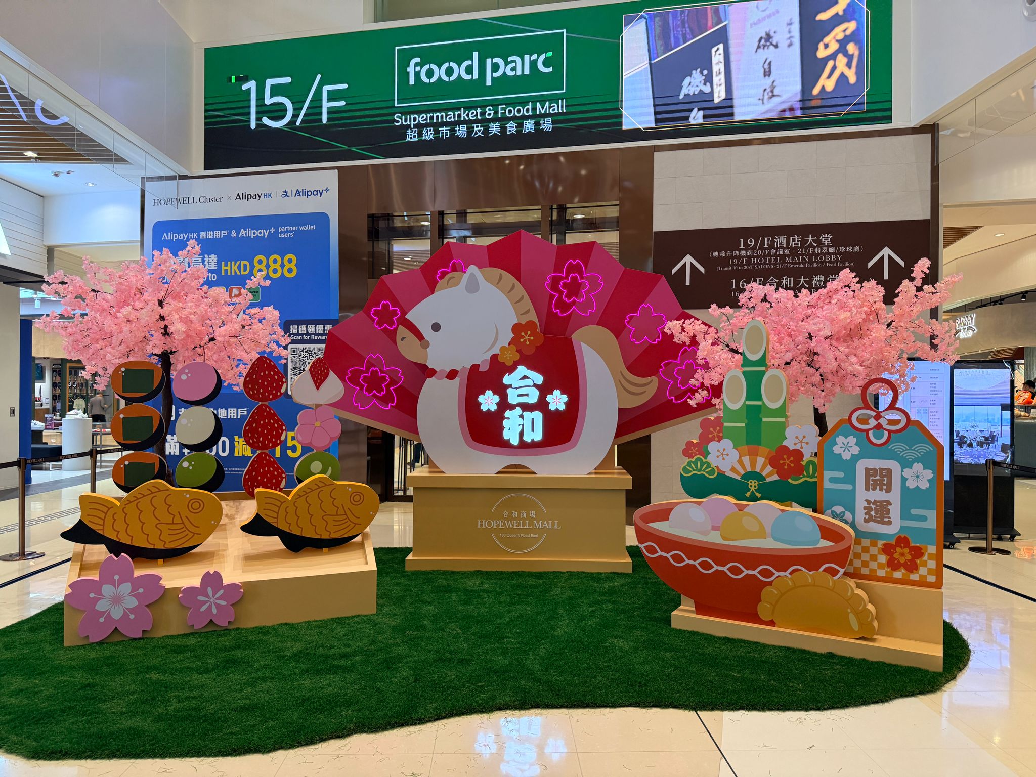 穿上「合和」二字紅色催運馬鞍的白馬,於寓意團圓與財富的湯圓及餃子、巨型開運御守、賀年三色糰子的簇擁下亦將來到中庭,祝福大家新一年萬事和合、馬到功成!