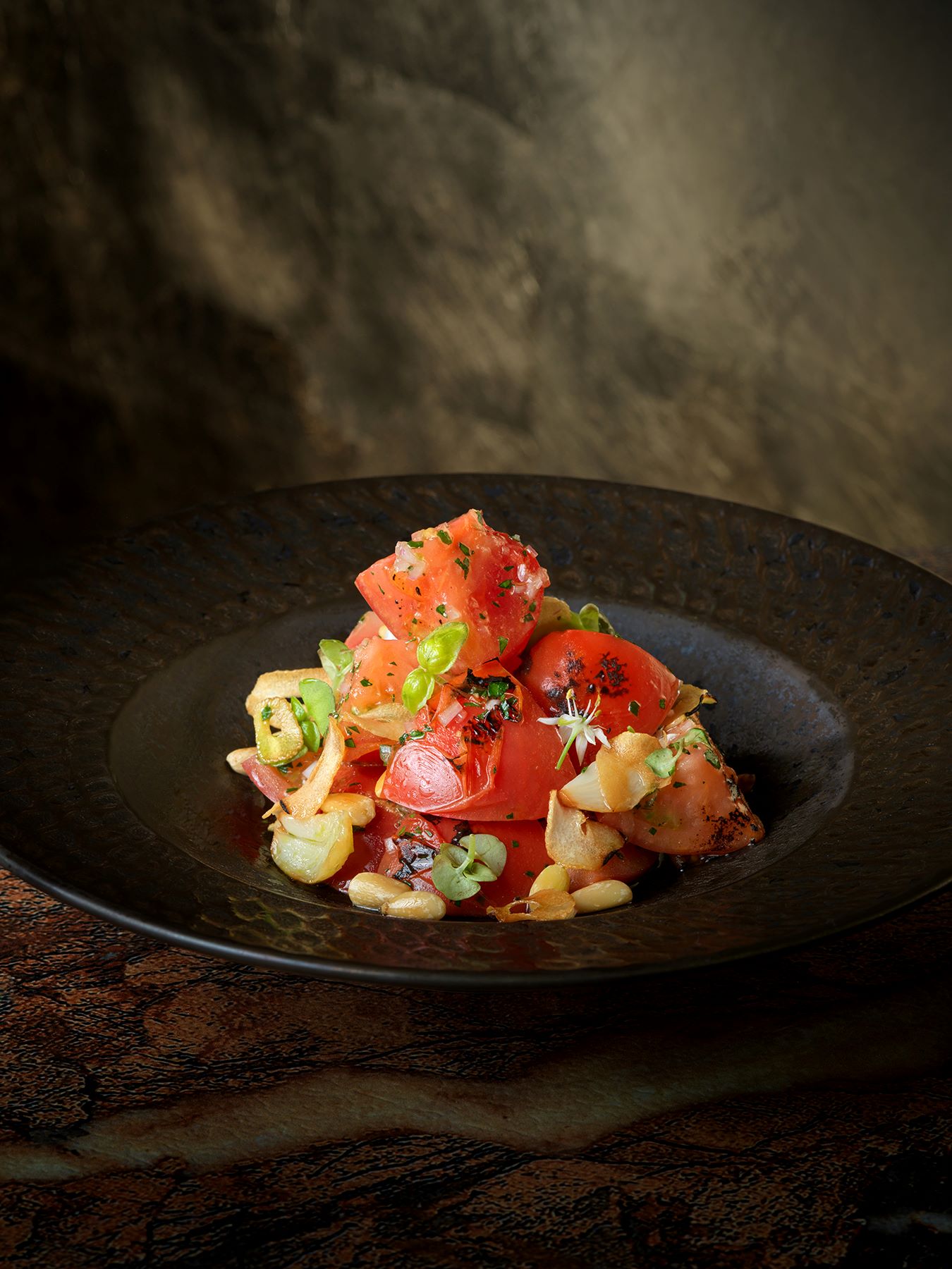 澳洲A5和牛胸腹肉(Brisket)先以日式醬汁慢煮至纖維鬆軟,再經由荔枝柴火炙烤上色,賦予其迷人的果木燻香,佐以西班牙風味的 Romesco 醬,在濃厚油脂與清甜微辛之間取得完美平衡。