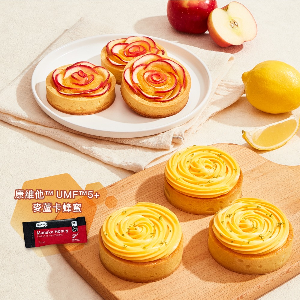 在「康維他TM麥蘆卡蜂蜜檸檬玫瑰撻及蘋果玫瑰杏仁撻」課堂中,參加者將親手完成兩款外型精緻、氣質滿分的玫瑰造型撻,「麥蘆卡蜂蜜檸檬玫瑰撻」採用來自新西蘭的「康維他™UMF™ 5+麥蘆卡蜂蜜」,含豐富維生素、礦物質和天然抗氧化成分,不只是甜味的來源,更進一步提升製成品的整體風味。甜香柔和的蜂蜜與檸檬餡料的清新酸甜相互平衡,再配合底層香脆的杏仁甜撻皮,入口清爽、回韻甘香,層次感直接拉滿。
