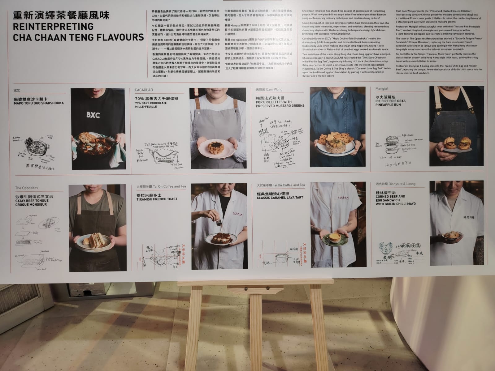 展覽凝聚跨界別創作人,包括建築師、產品設計師、平面設計師、木工職人、學術研究者員、電影人、廚師等,以「設計」作為核心切入點,全方位解構「茶記」,透過視、聽、觸、嗅等多重感官體驗,以「重現」與「再創作」的方式,將研究結果轉化為七個展區當中豐富多元的展覽內容,梳理「茶餐廳」於香港流行文化中的獨特位置。