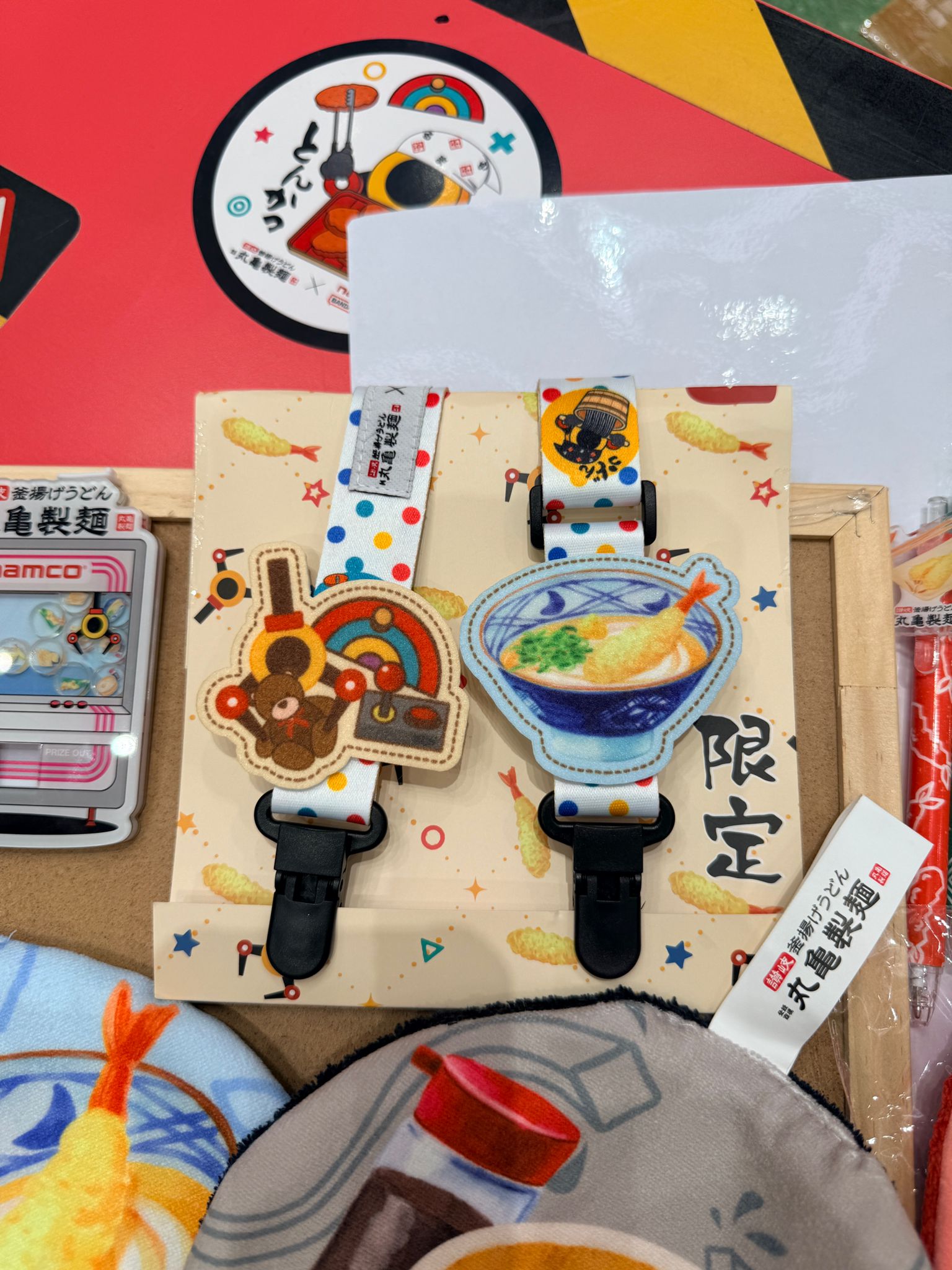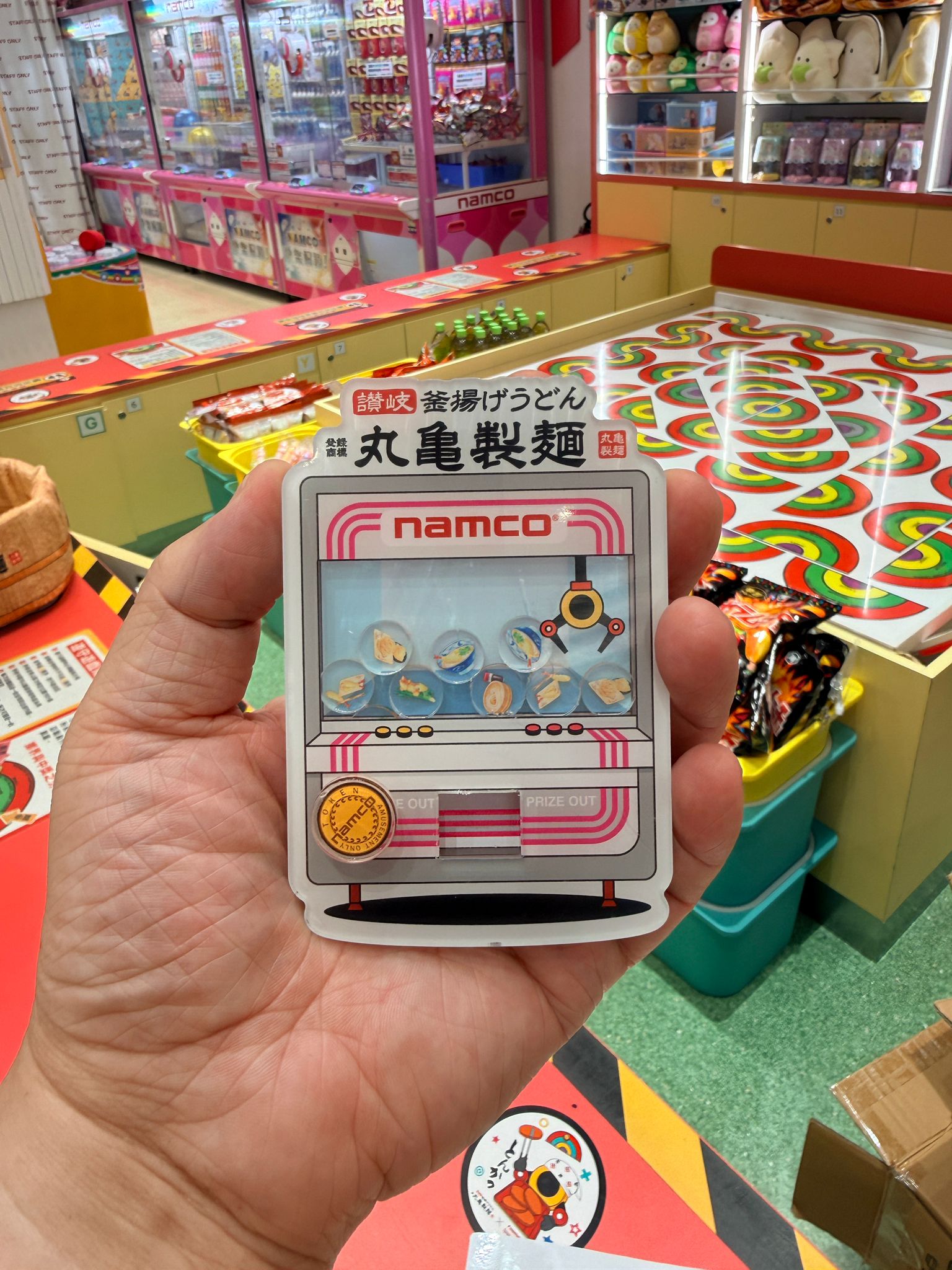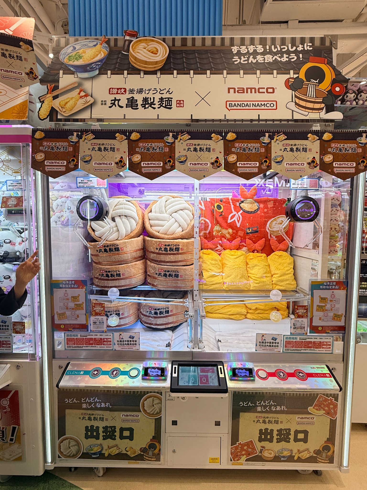 今次聯乘,NAMCO 將特設 5 間主題店,包括啟德體育園店、屯門市廣場店、圍方店、銅鑼灣皇室堡店、將軍澳 Popcorn 店。走進 NAMCO 主題店,入口處夾公仔機內特設「主食景品專區」,陳列著是次聯乘其中最矚目的原創景品,捲起時是金黃酥脆天婦羅炸蝦、打開即變成保暖小被的「天婦羅蝦被」,以及綴有兩個品牌標誌性扣飾的「多用途夾」,讓玩家彷彿走進丸亀製麵的開放式廚房,開啟流水式「看、選、拿、加」傳統極速出餐體驗,親手將「美食」夾走。