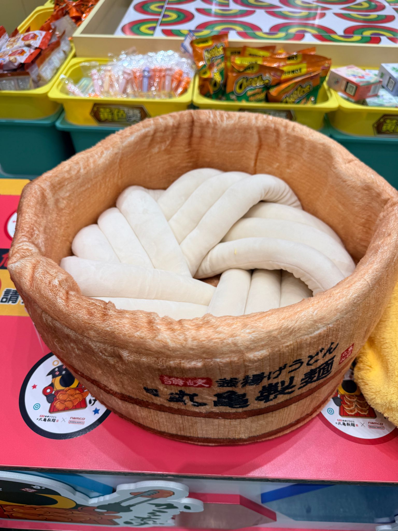 同步推出的「木桶寵物窩」景品,將丸亀製麵標誌性的釜揚烏冬木桶,變身成一眾「主子」最愛的安樂窩,讓毛孩也能沉醉於烏冬天堂之中;沒有養寵物的您亦可以木桶內的「烏冬」當作坐墊,或將整個景品作家居裝飾。