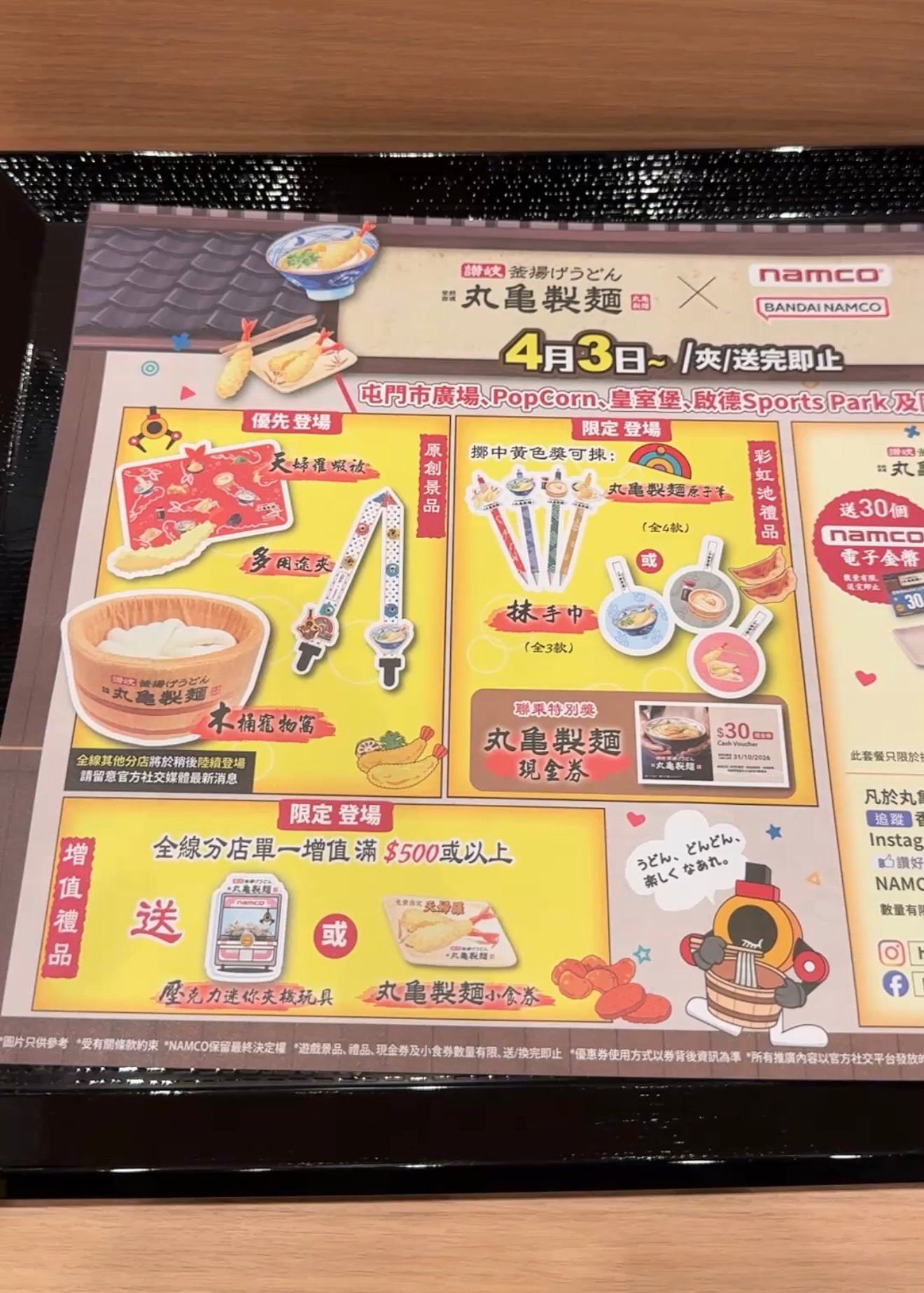 另外,由 4 月 3 日起,凡於丸亀製麵指定啟德體育園店、屯門市廣場店、新城市廣場店、銅鑼灣希慎廣場店、將軍澳廣場店消費滿$60,即可獲贈 NAMCO 金幣兌換券延續歡樂時光。