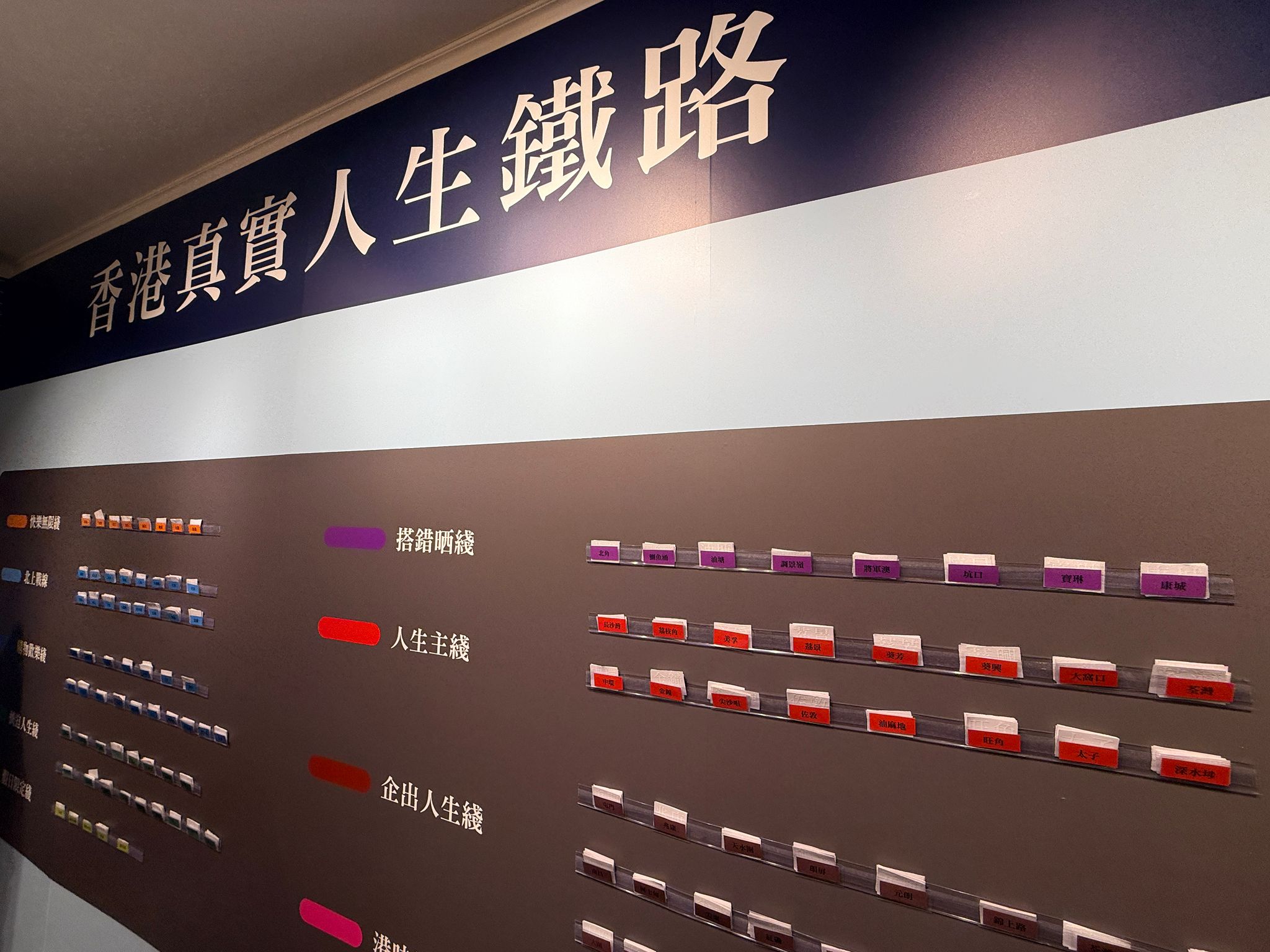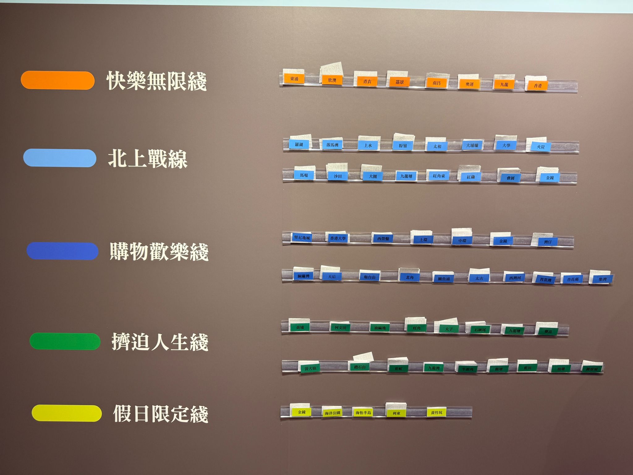 場內設有鐵路貼紙牆,可以找到多條熟悉又富趣味的「路線」——包括 快樂無限綫、人生主綫、港味綫、拼迫人生綫 等等。每一條綫都象徵著香港的主要鐵路,一站接一站,串連出屬於生活的幽默、堅持與溫度。