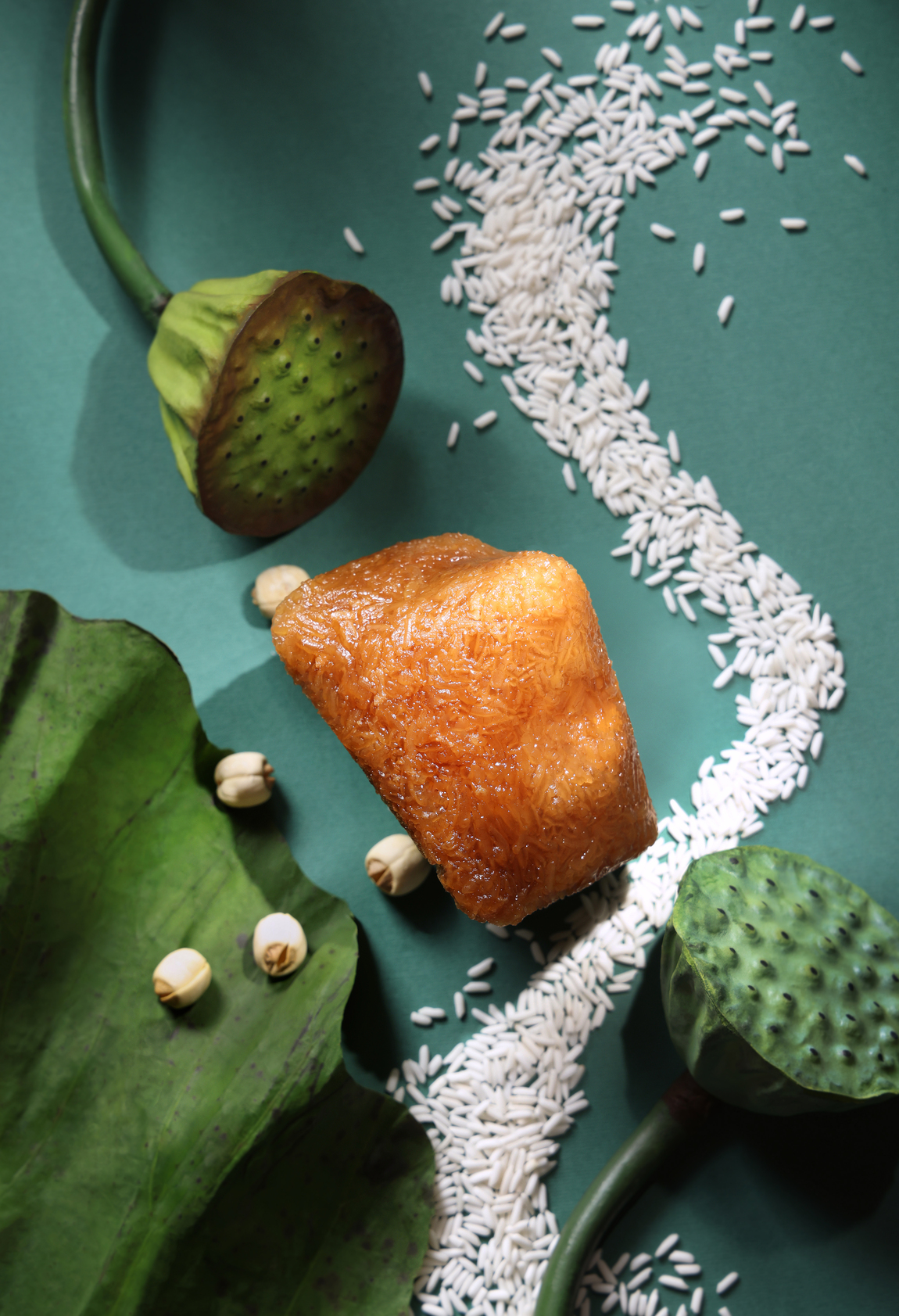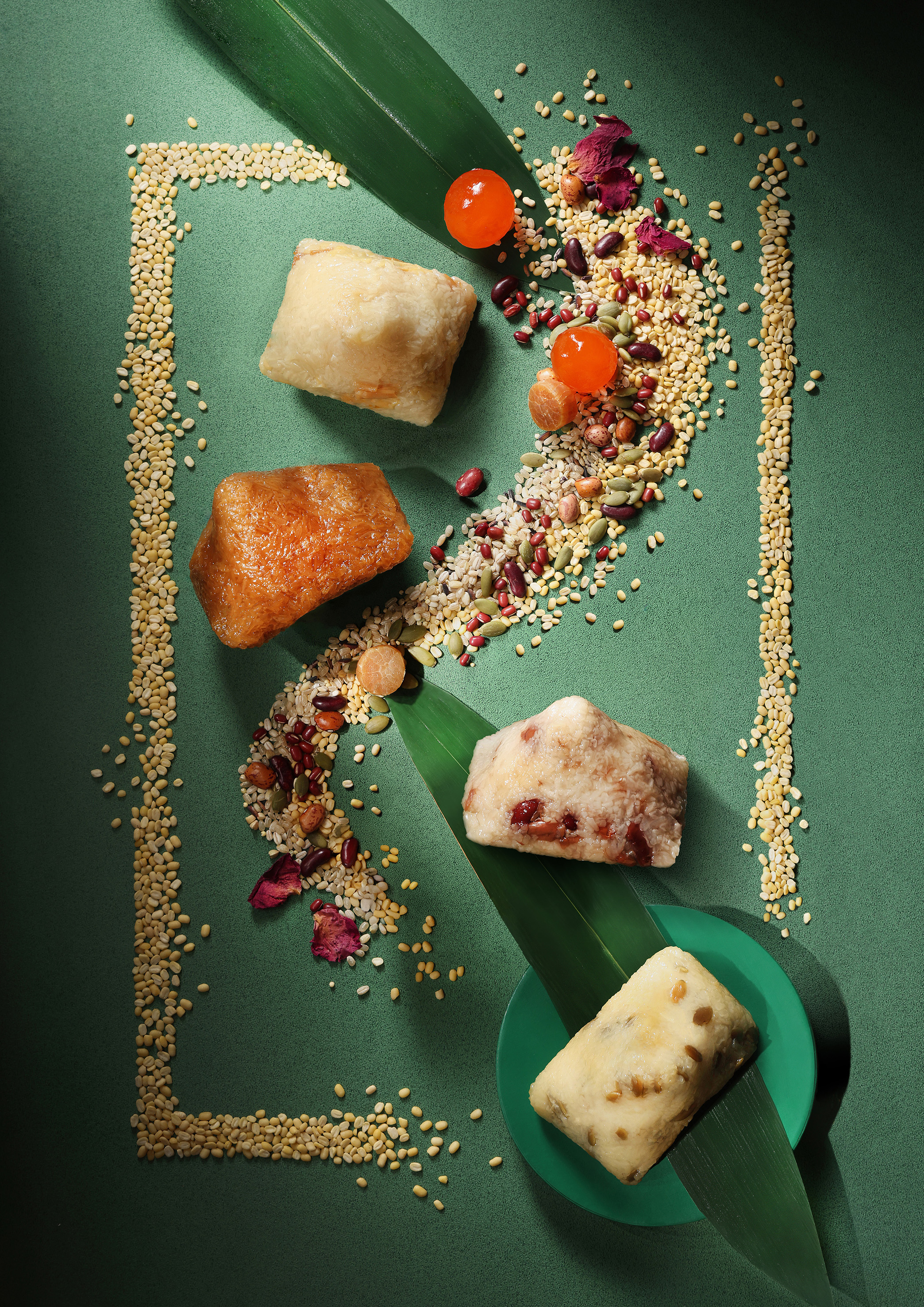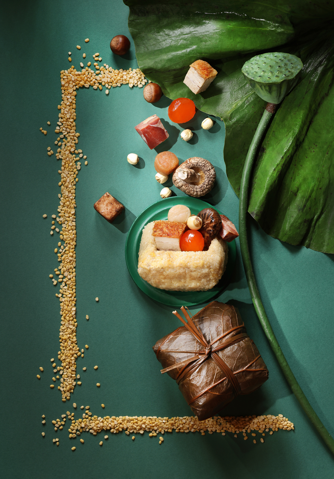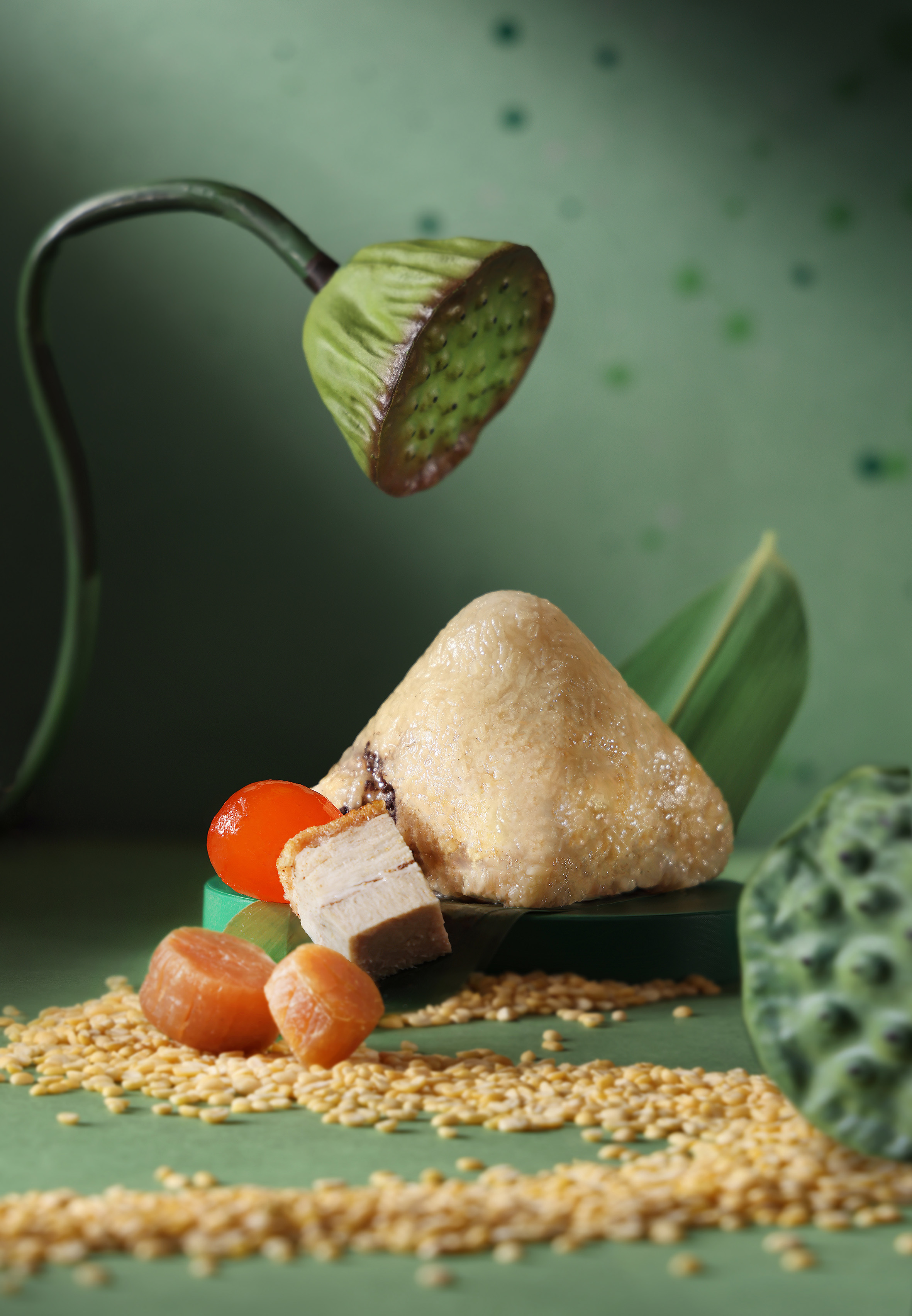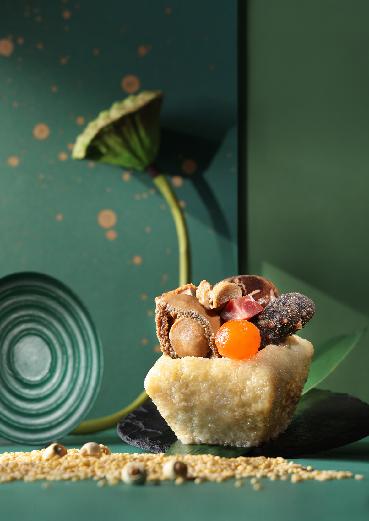 以中國名菜佛跳牆作為靈感,餡料用上多款矜貴食材,包括原隻鮑魚、滋補海參、原粒瑤柱甫、冬菇、金華火腿等炮製而成,並特別以頂級挑骨腩肉代替傳統肥肉,帶來升級滋味。蒸煮後,食材鮮味共冶一爐,滲透糯米之中,香氣四溢,將原盅佛跳牆完美昇華成應節奢華的五月糭。