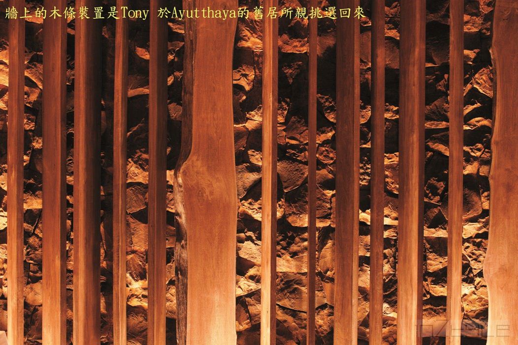 餐廳內的地磚是美國設計師Tony Chi自行設計繪畫,圖案靈感源自古典歐洲室內設計和藝術,再把繪圖送往工廠拼貼到瓷磚上,再以技術使瓷磚變舊及帶一些回到昔日的感覺。牆上的木製件裝飾是Tony親自往泰國大城府Ayutthaya的舊房子中搜尋,確保品質和木材的顏色和紋理的一致性。回首仰望天花板時,你會發覺一些地區的木制天花板利用之鴉片墊的紋理。