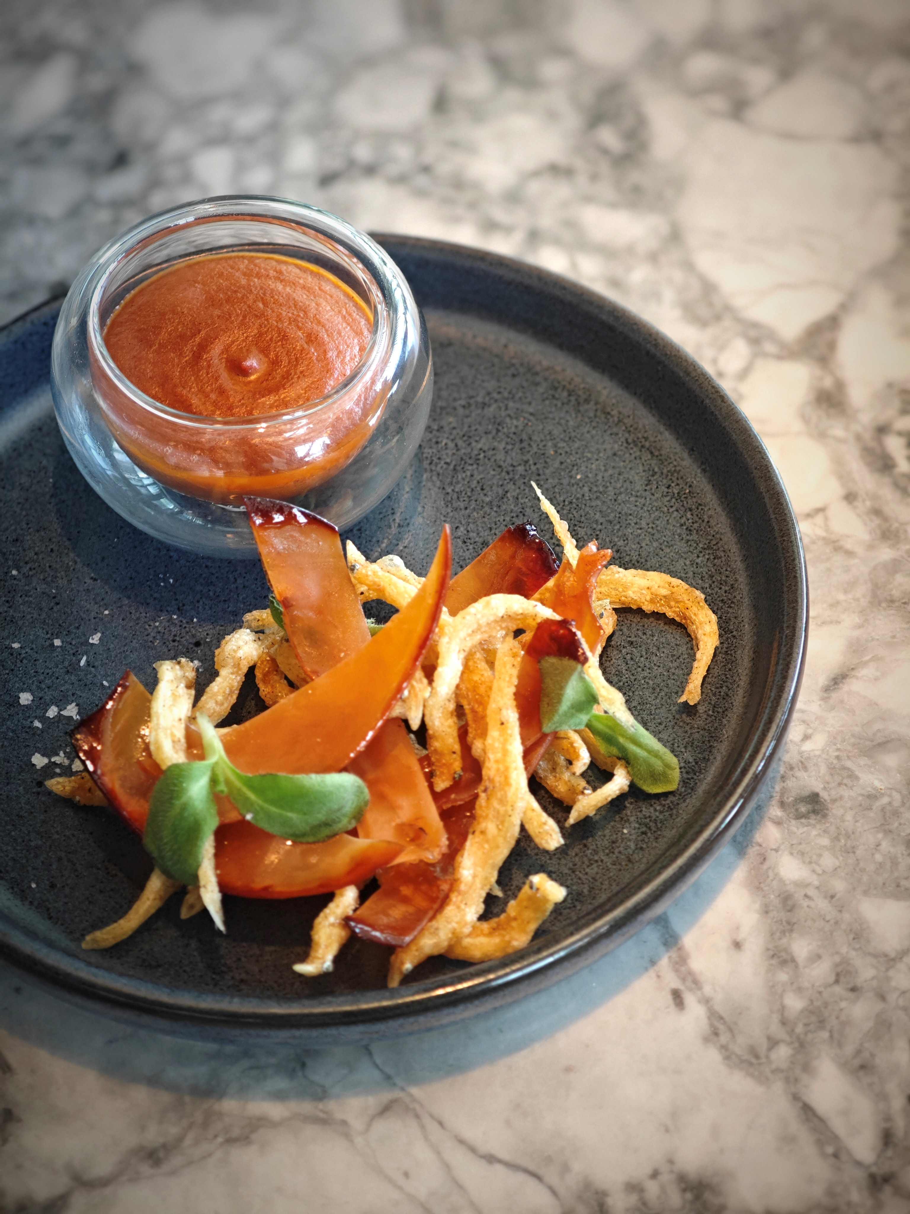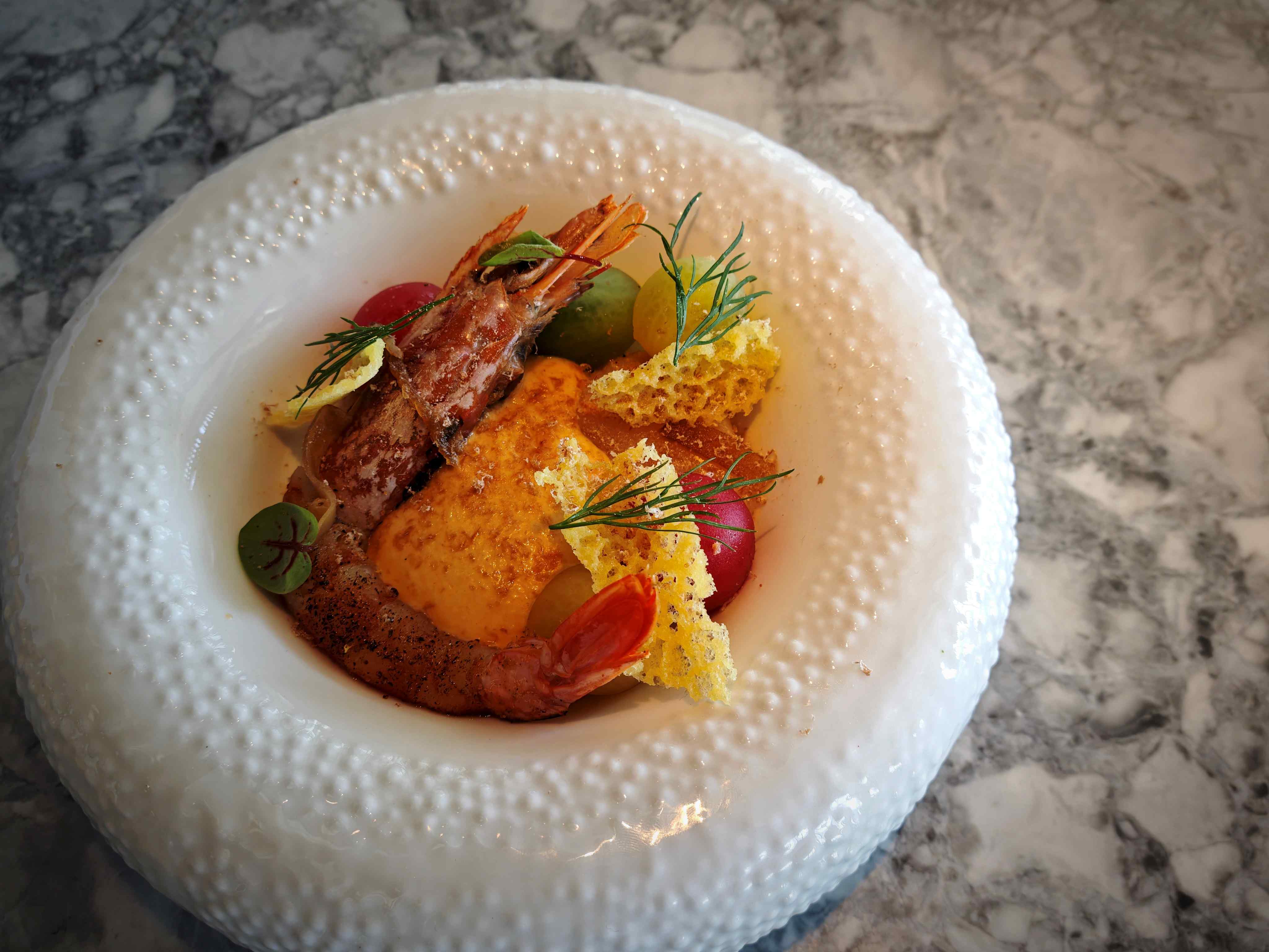 以番茄、青瓜及本地長尖椒打成細滑綿密的泡沫濃湯,配上鮮味盎然的炙燒阿根廷紅蝦刺身及北海道帶子,另佐以話梅汁漬浸的本地車厘茄及少許黑糖薑汁作點綴,一道匯聚鮮、甜、鹹、香、辣五味層次的港式凍湯,滋味交織。
