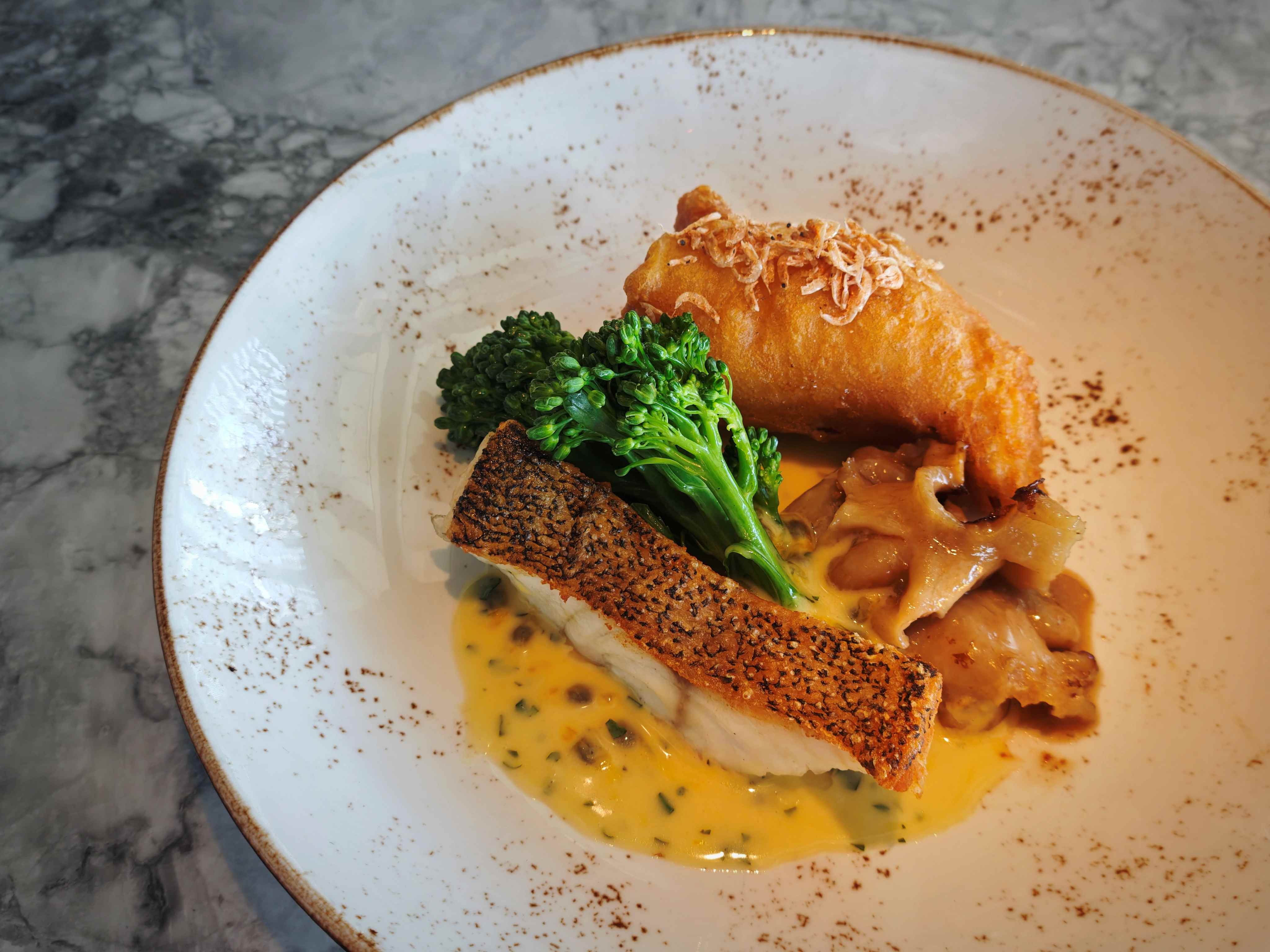 採用新鮮石斑魚柳,一塊裹上自家製麵糊酥炸,猶如英式炸魚,外層金黃酥脆,內裡魚肉嫩滑多汁,佐以鹹香濃郁的大澳櫻花蝦乾,添上地道風味;另一塊則以香煎方式處理,魚皮微焦酥香,魚肉細嫩鮮美,呈現另一番食味層次。搭配香煎花膠扒及熱情果柚子汁,酸香清新,為這道矜貴佳餚添上亮麗點綴。