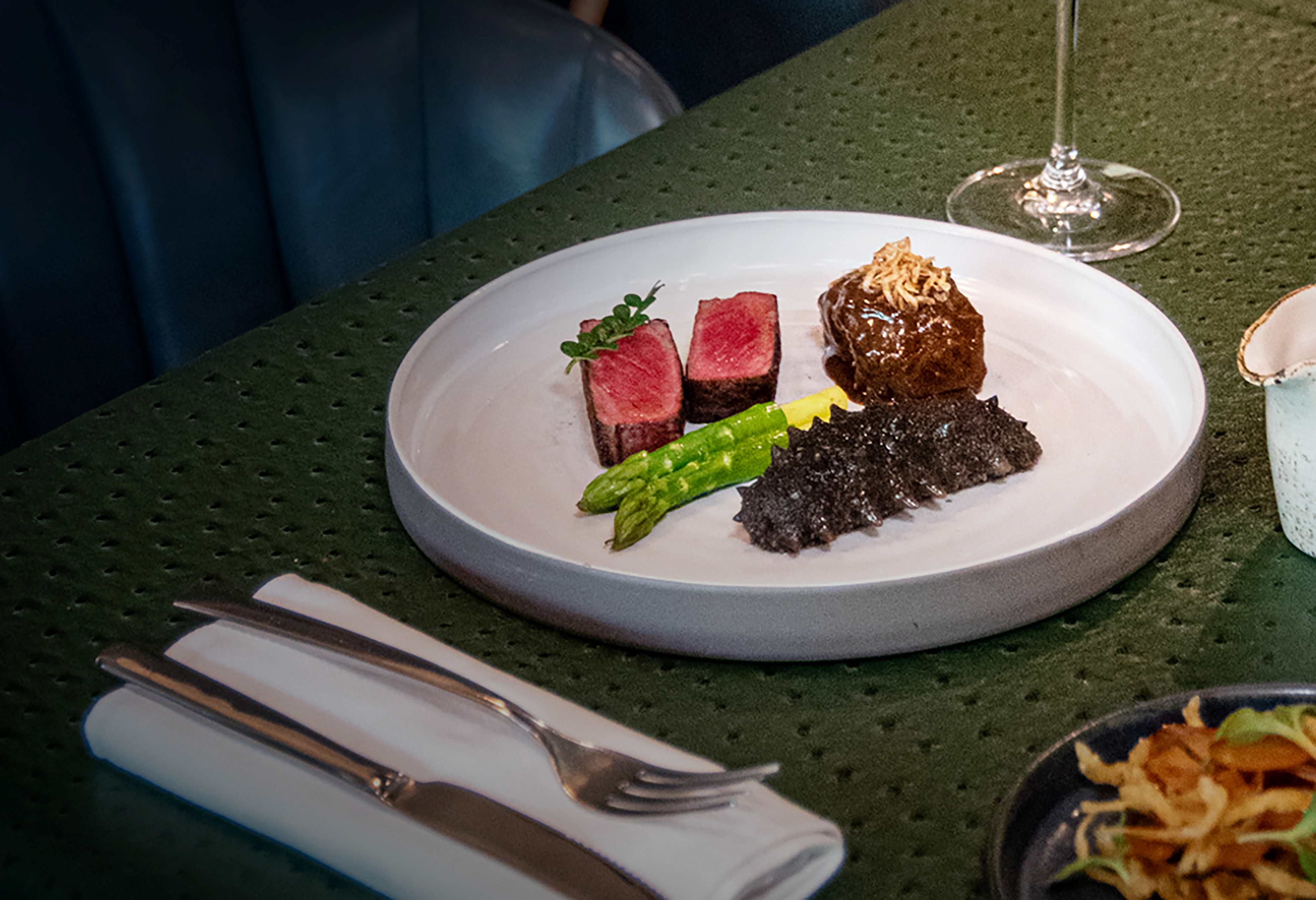 薈萃中西方高級食材,香煎澳洲 M4 和牛油脂豐膄,與蠔油扣海參展現海陸交融的層次風味。佐以首創的大澳蝦醬紅酒汁,鹹香濃郁,餘韻悠長。