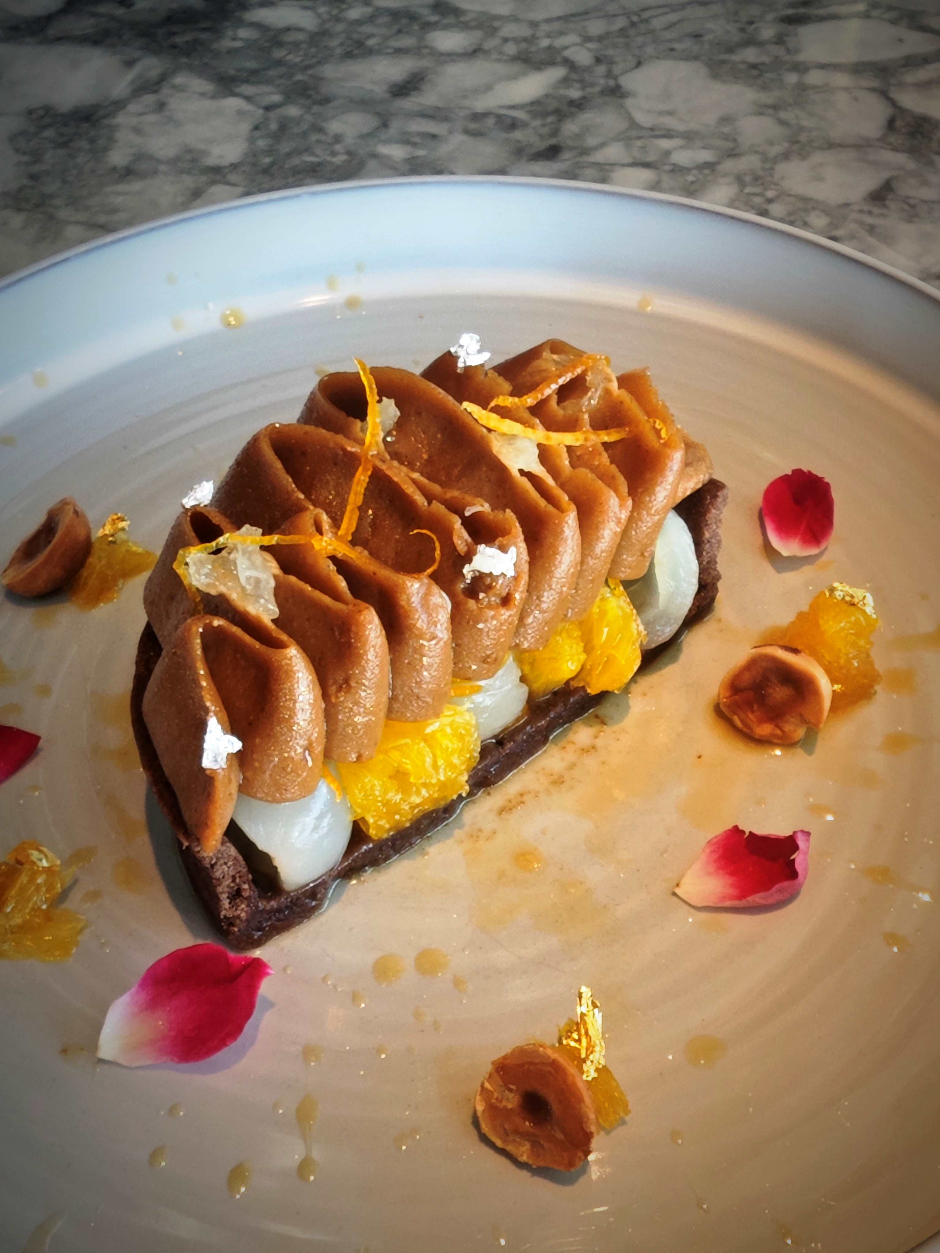 賣相精緻的榛子朱古力慕絲撻,特別加入果皮、龍眼及本地麥芽糖製作,香濃馥郁,為這個充滿驚喜的味覺之旅劃上完美句號。