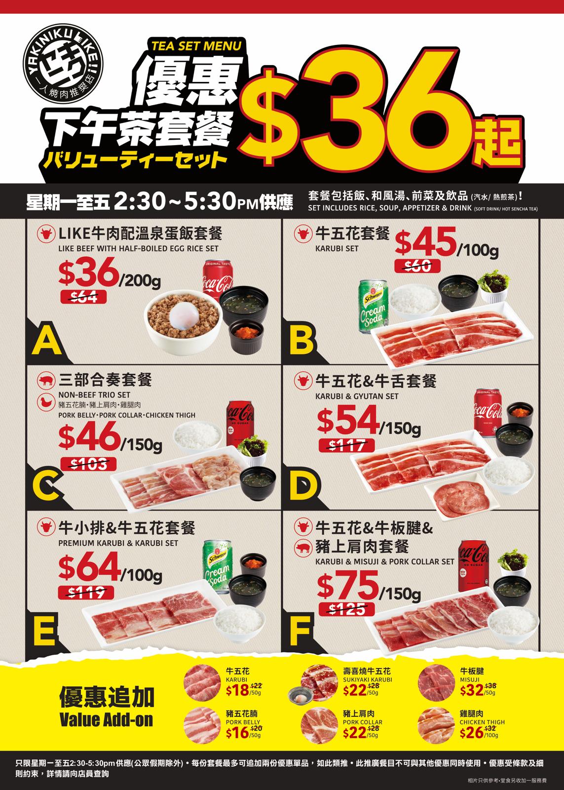平日星期一至五限定的優惠下午茶套餐於全線分店適用,共 6 款套餐選擇,豬、牛、雞通通齊!最平「LIKE 牛肉配溫泉蛋飯套餐」只需$36!還有新增「牛五花 & 牛板腱 & 豬上肩肉套餐」,選擇更多更滿足!